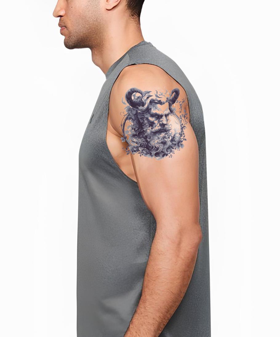 让您的肌肤沉浸在希腊神话的迷人魅力中,这款惊艳的黑灰色纹身设计完美地体现了哈迪斯的宏伟,他是神秘的希腊冥界之神。这个设计类似于经典雕像,体现了神性与地狱的戏剧性交织。