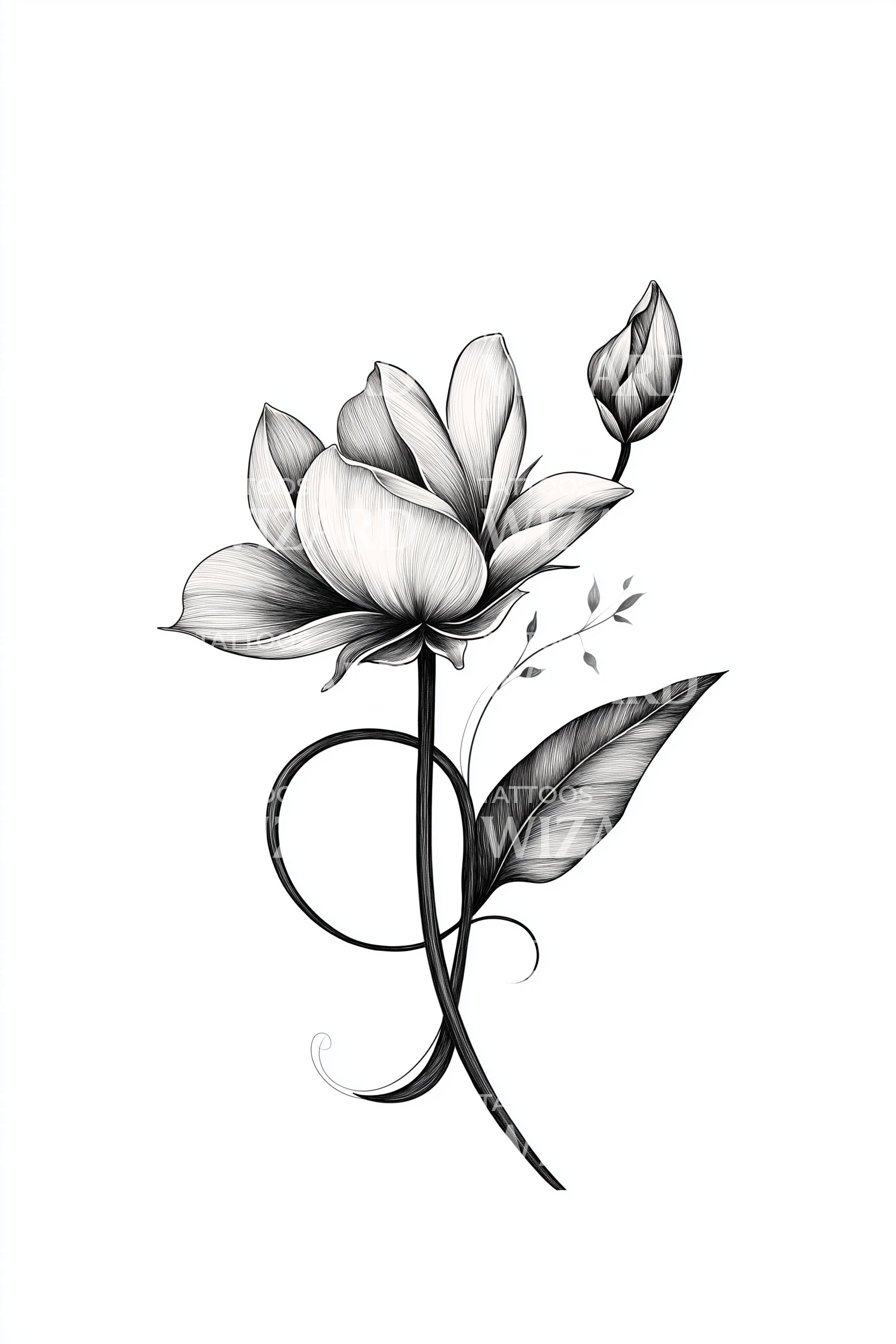 体验这款独特黑灰纹身设计中光与暗的迷人对比。作品以一个光环圆圈包围的醒目花卉簇为特色。花朵元素增添了自然灵感的美感,与黑灰墨水形成鲜明对比。非常适合喜爱复杂且富有象征意义纹身的您。