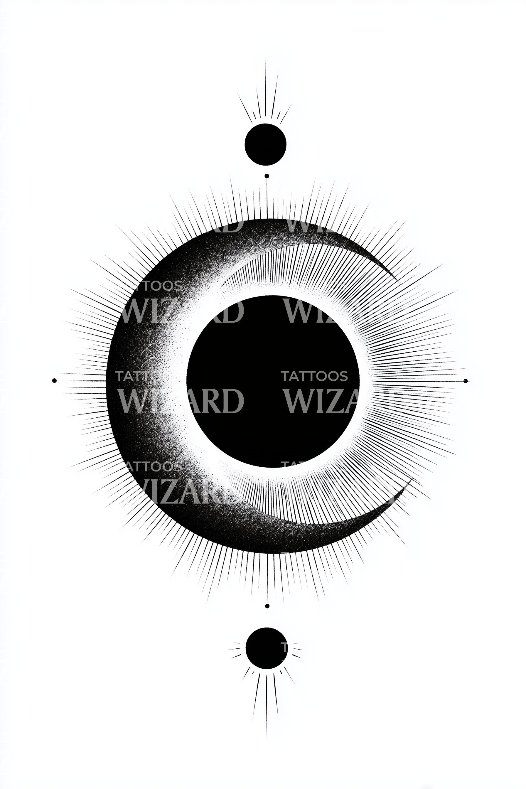 A clean eclipse halo encircles a deep black orb, stroked with fine rays and soft stipple. Minimal crescents cradle the light, with tiny satellites marking balance. Symbol of cycles, renewal, and quiet power. Worn, it feels calm, centered, and luminous, a personal horizon held close through every season.