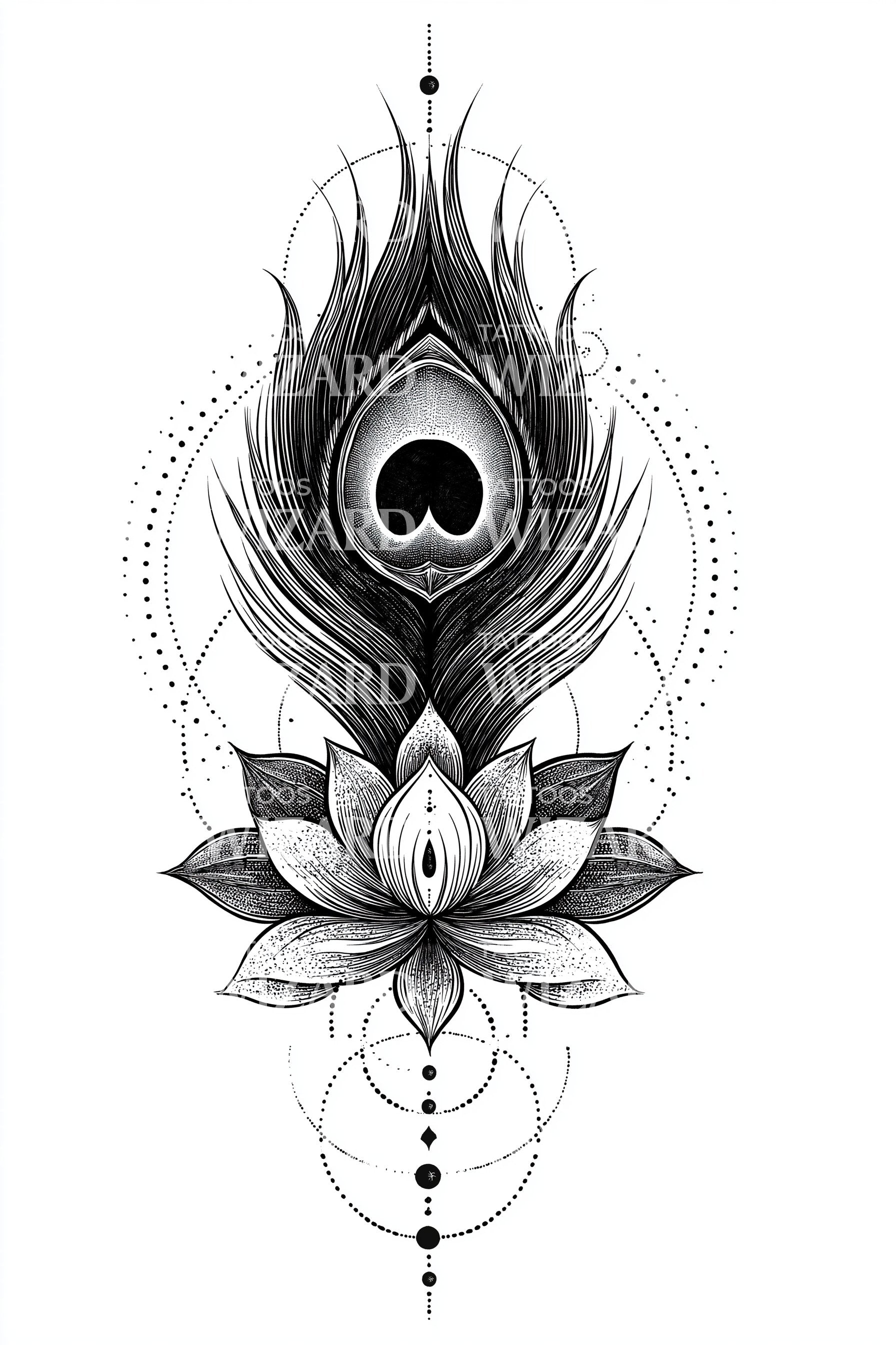 体验这款装饰性纹身设计带来的神圣宁静。它以精细的点描工艺为特色,融合了宁静的莲花、飘渺的羽毛和光辉的光环。多种元素的结合形成了纯洁与超越的象征,使其成为通过永恒墨艺表达自我的迷人选择。