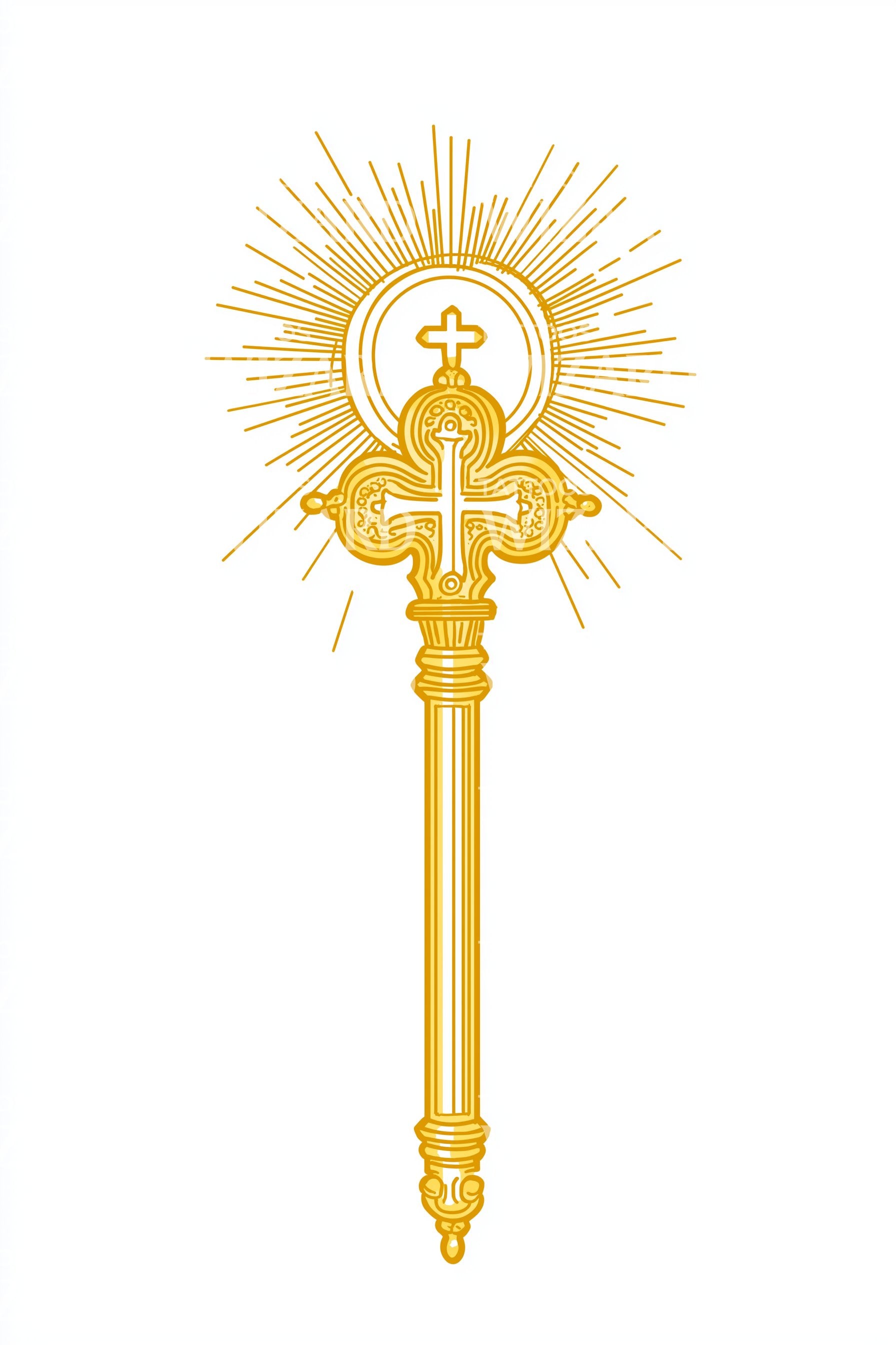 一个受神圣纹章启发的装饰性纹身设计:一把华丽的钥匙,顶端冠以光辉的光环,周围环绕着巴洛克风格的花丝细工。微妙地致敬圣座,赞颂内心的圣者,以金色线条呈现。一个永恒的守护、奉献与力量的象征,非常适合前臂或胸骨部位。