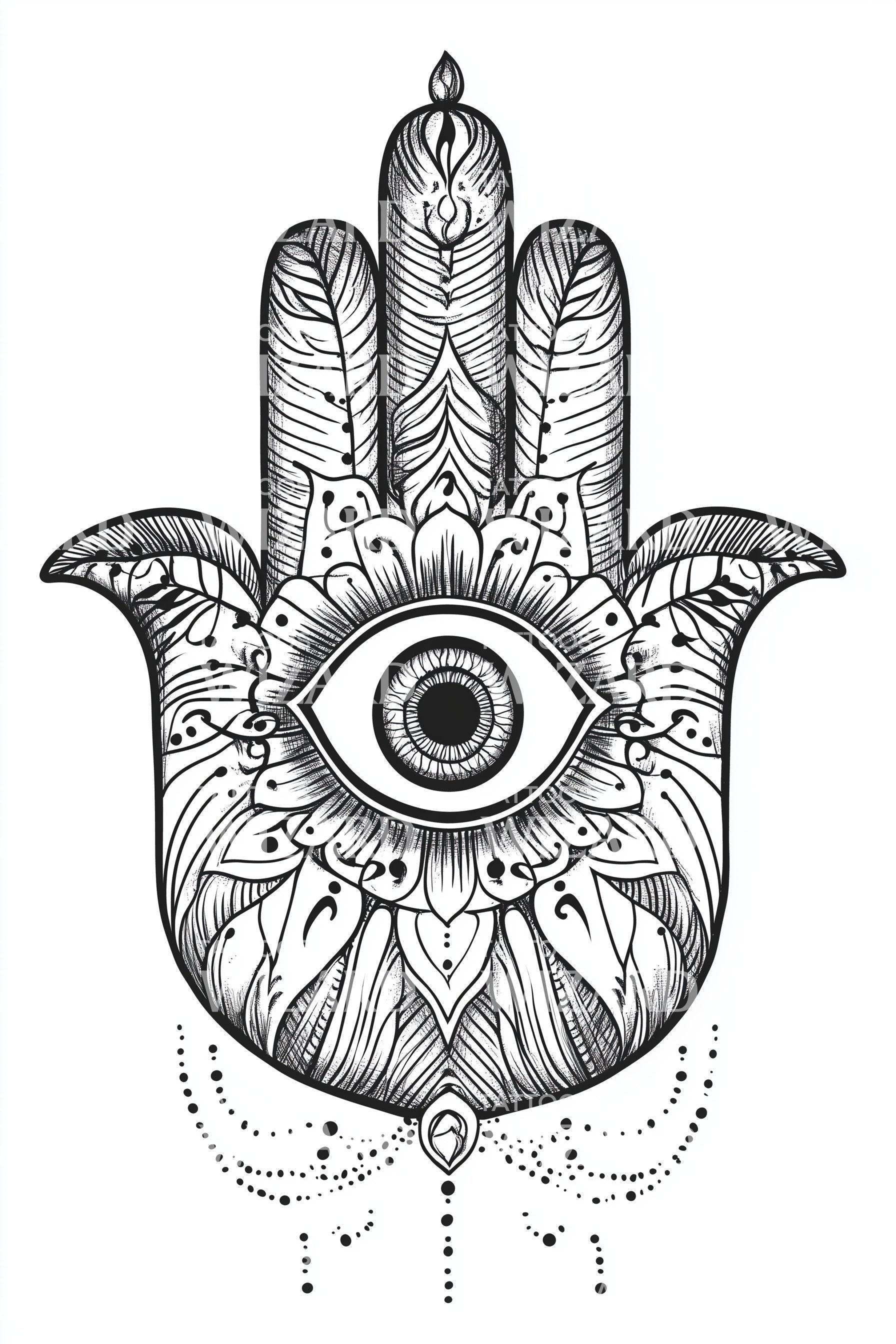 Sacred Hamsa in fine-line filigree, a mandala blooming around a vigilant eye, with leafy motifs and soft dotwork. Emblem of protection and intuition, it repels harm and steadies presence. Feels grounded, luminous, courageous. Ideal placements: sternum for symmetry; forearm for guidance; upper back for guardianship; calf for flow.