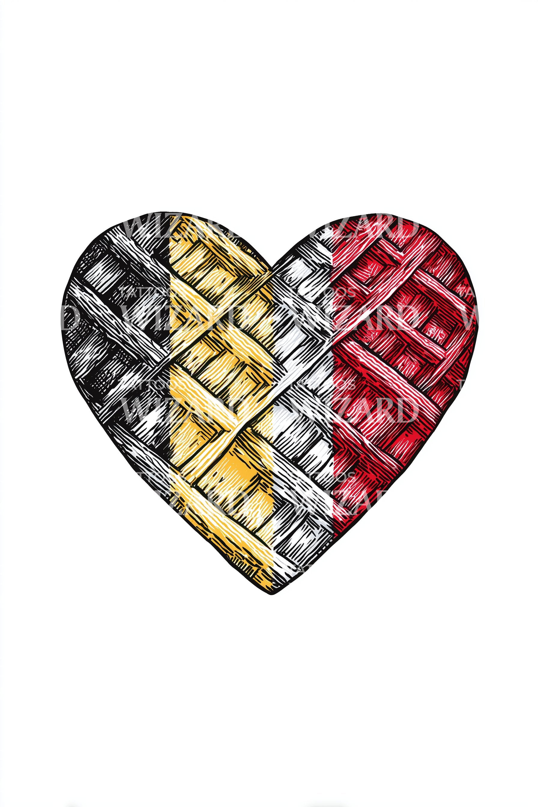 沉浸于比利时精神的插画纹身设计中。它巧妙地将比利时国旗与粗犷、质感的美学融合在一起。注入爱意的心形符号强烈地突出,体现了对充满活力文化的热情。为那些敢于表达真情的人打造的独特作品。