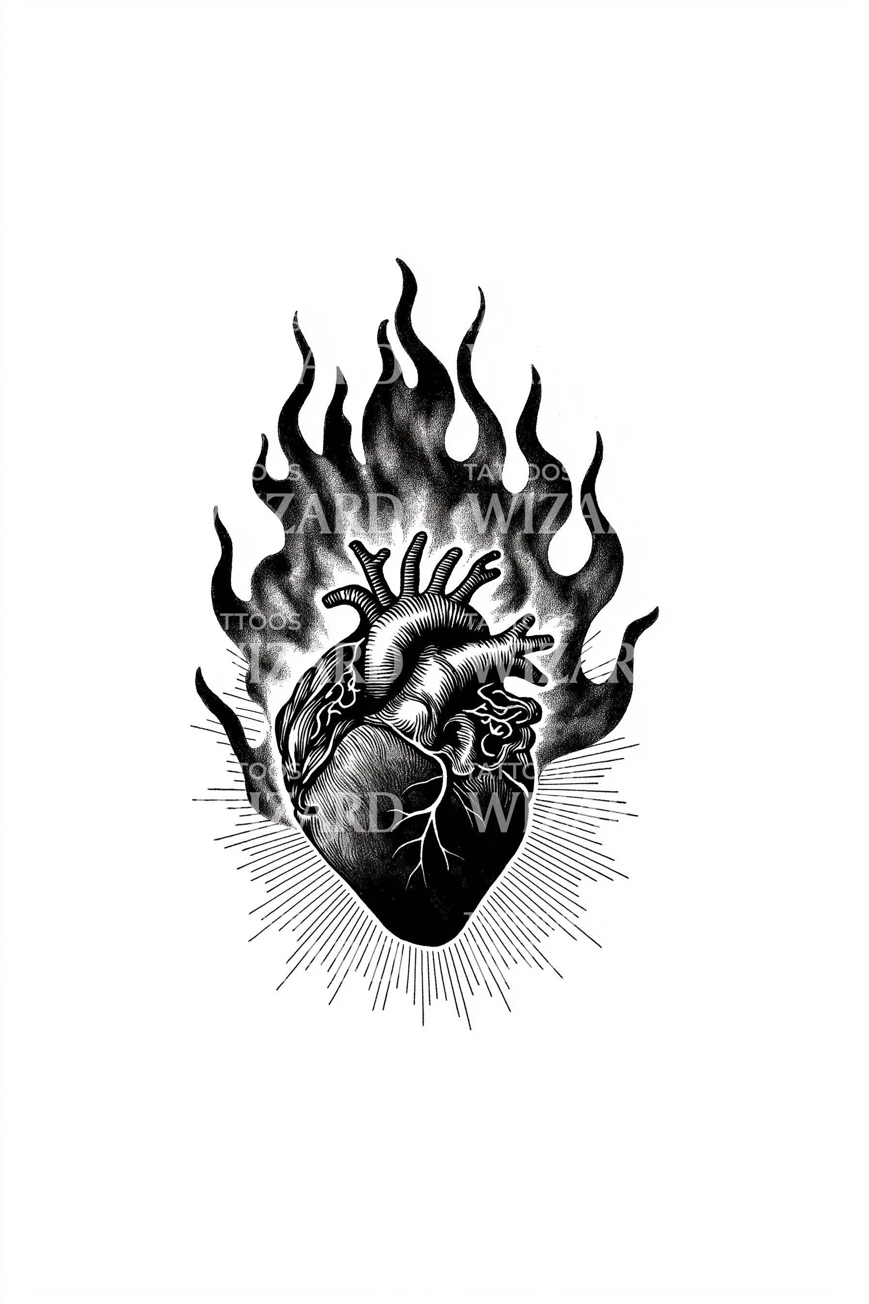 沉浸于这款黑灰纹身设计的强烈感受,一颗心被热情燃烧的火焰所捕捉。设计精细描绘了解剖特征,火焰增添了迷人的魅力。这是一个令人着迷且充满力量的象征,代表着持久的爱与不懈的激情,准备在你的肌肤上留下永久的印记。