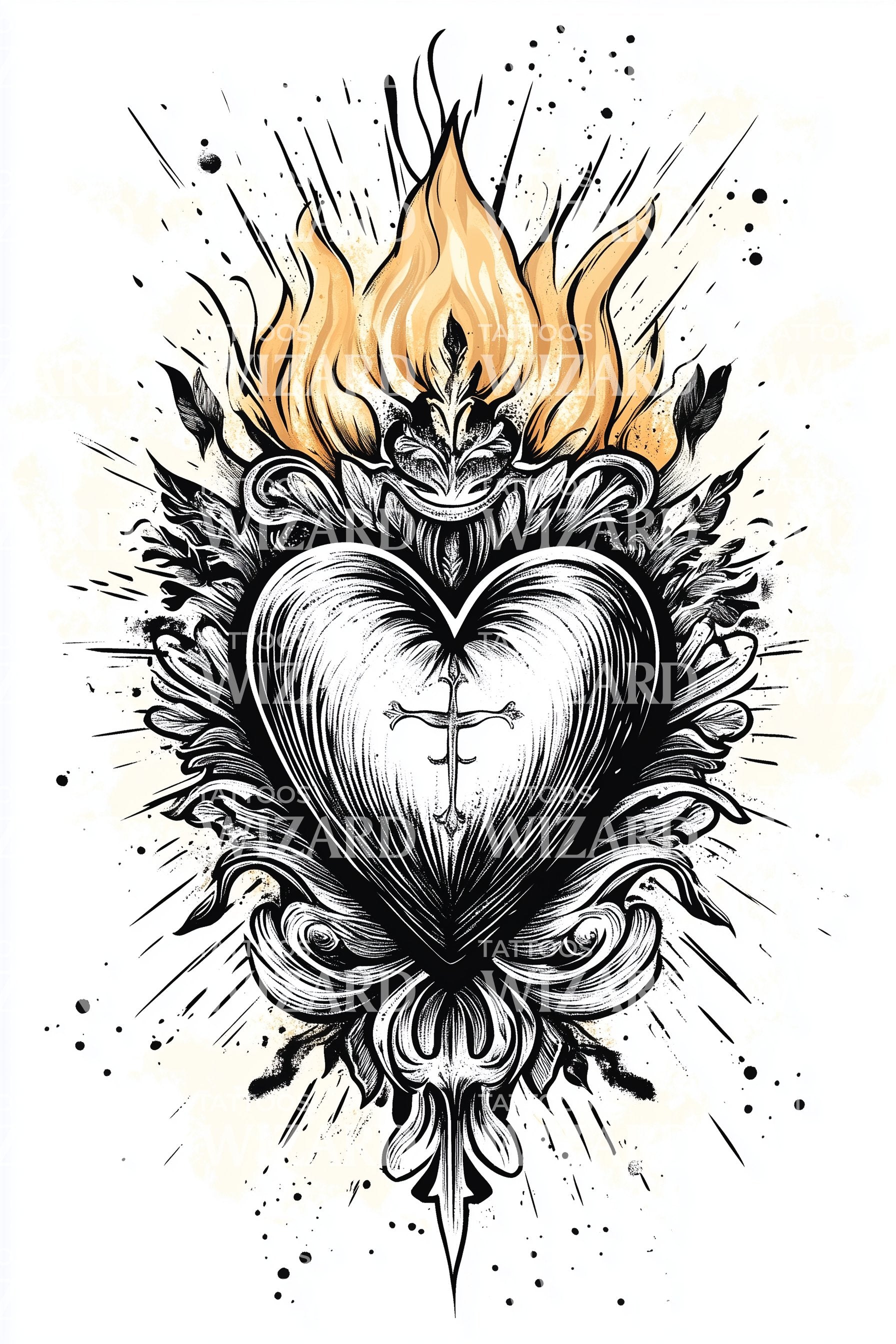 沉浸于象征意义之中,这款神圣而富有灵性的心形纹身设计被火焰点燃。以装饰性细节精心打造,这件黑色纹身作品象征着爱与激情。诱人的火焰元素呼应着深刻的精神旅程,营造出力量、神秘与奉献的迷人融合。非常适合追求变革性身体艺术的你。