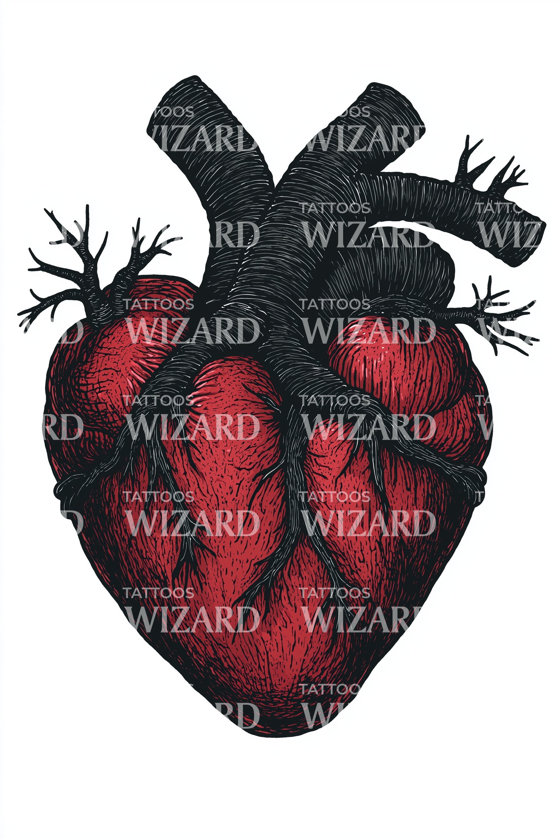 沉浸于生命跳动的脉搏中,这款令人惊叹的解剖心脏纹身设计以鲜艳的红色描绘,捕捉了跳动心脏的真实感,象征着激情、活力与坚韧。非常适合那些敢于表达内心情感的人。