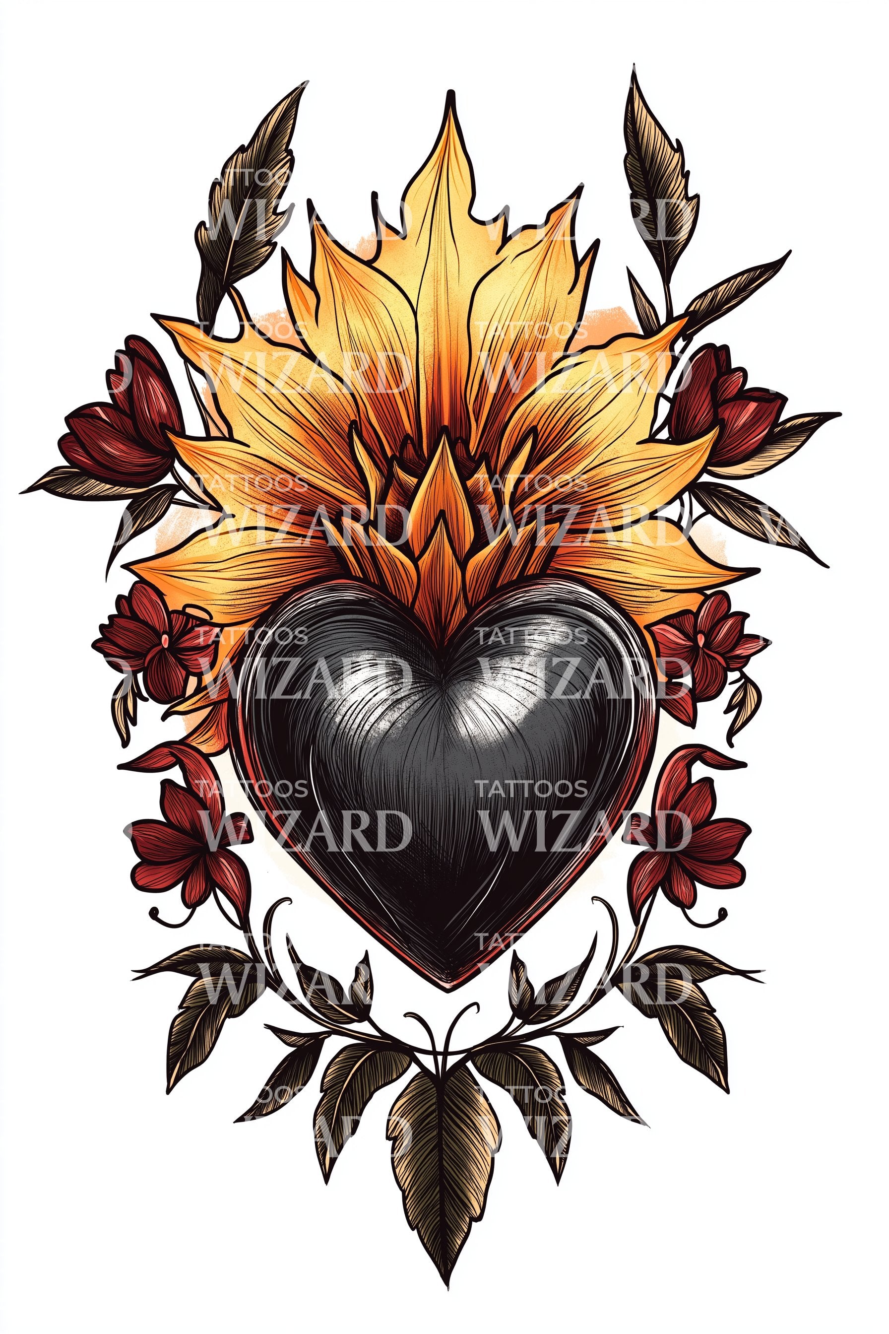 这款新传统纹身设计融合了心形与玫瑰的浪漫元素,环绕着炽热的火焰。以大胆鲜明的色彩对比装饰,它是经典象征的现代演绎,体现了激情与爱意,成为引人入胜的艺术表达。