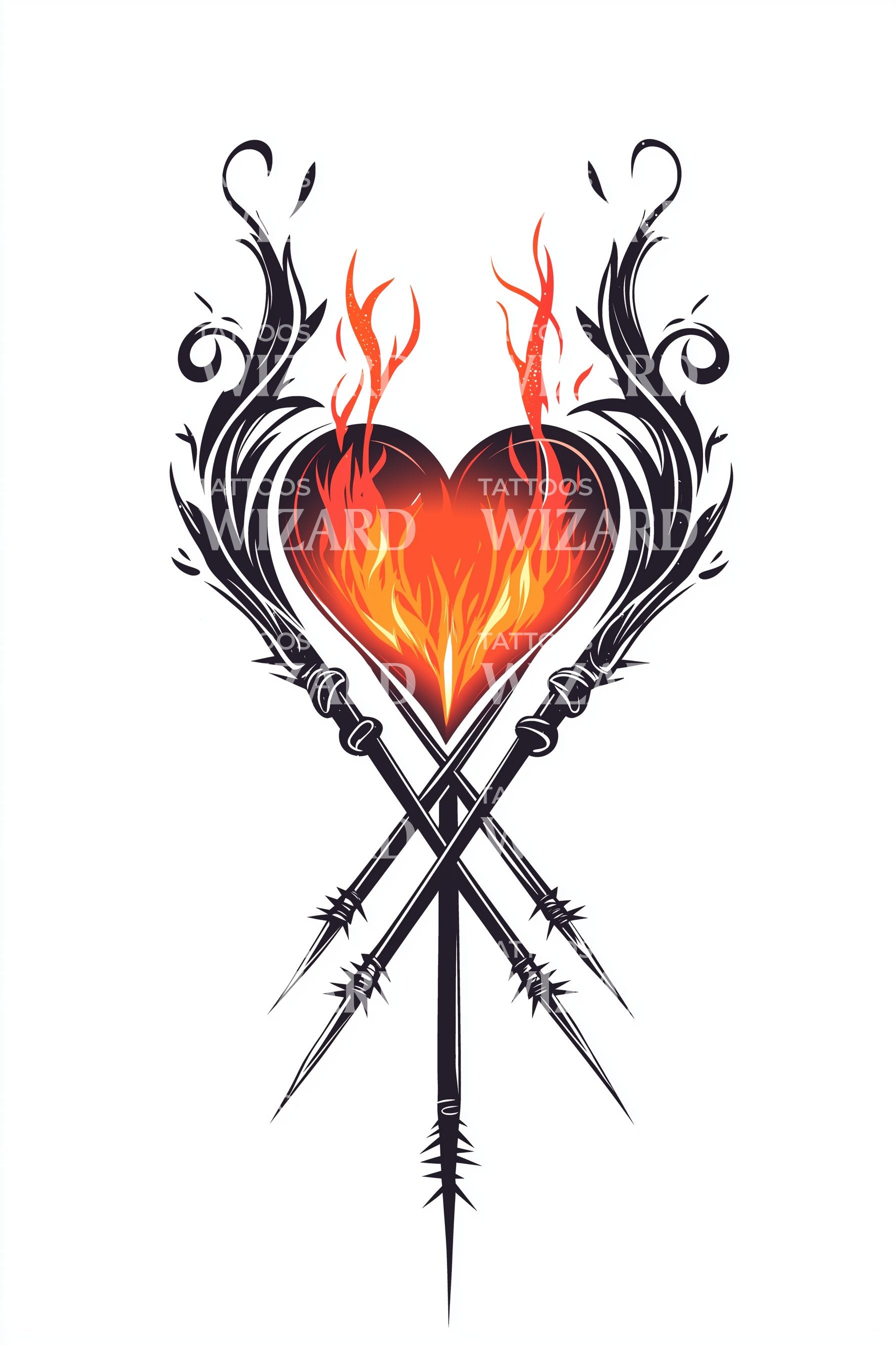 Neotraditional fire blooms from a sacred heart, framed by ornate black scrolls and crossed, barbed arrows. Bold lines cradle glowing embers, an iconic vow to endurance and devotion. Arrows mark direction through trials, while the flame sanctifies purpose. Wearer feels protected, decisive, and fiercely alive every single day.