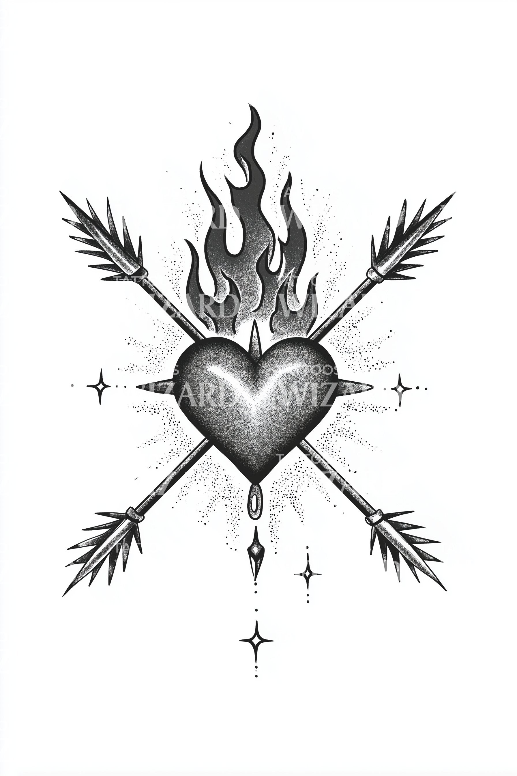 Silver heart crowned by rising flame, crossed with feathered arrows and haloed starbursts. Ornamental stipple gleams like sacred metal. The flame voices spirit, arrows mark trials survived, a falling tear honors healing, and stars guide faith. Worn close, it feels steadfast, courageous, luminous with tender devotion and grace.