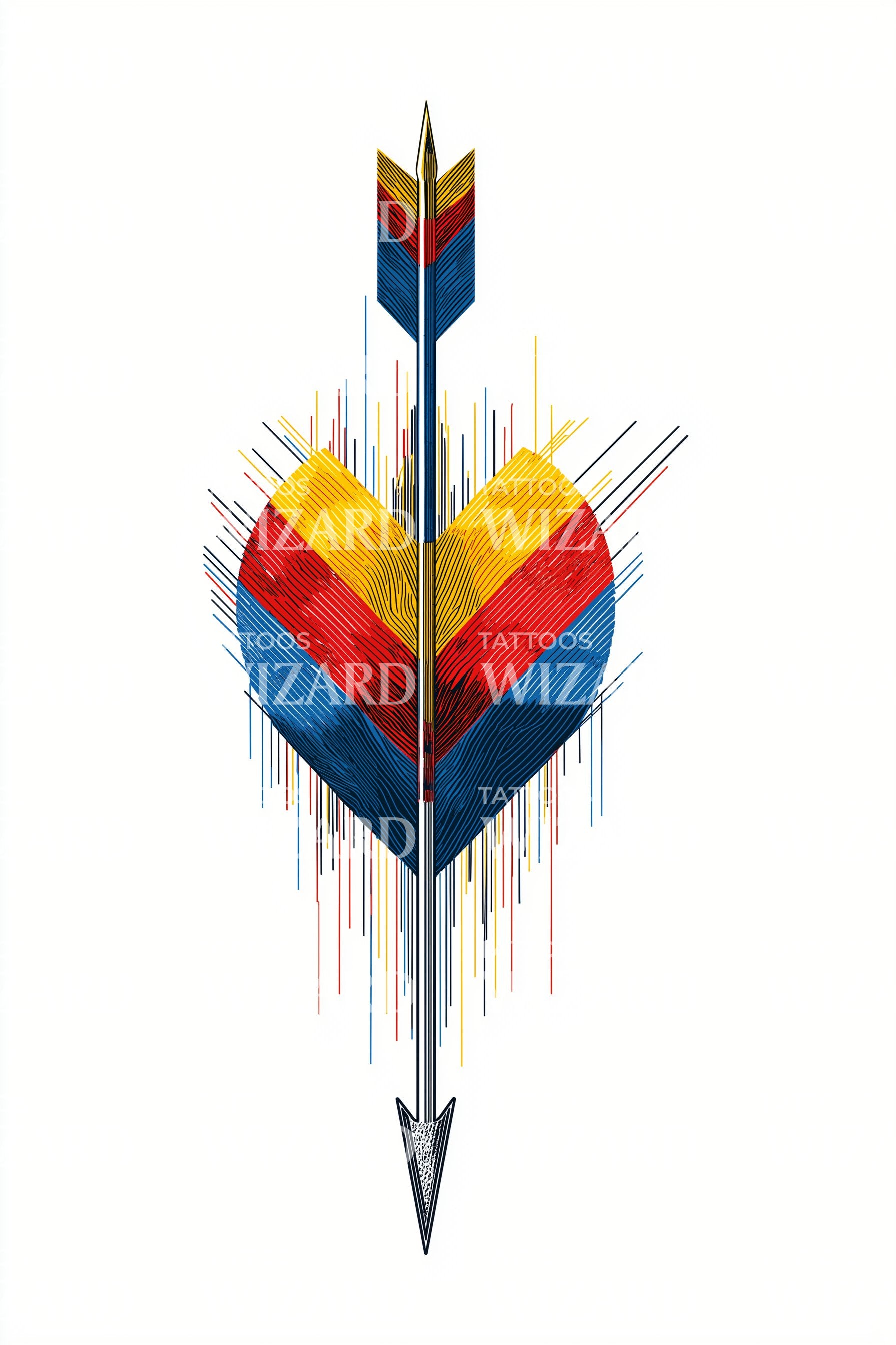 流动的水彩晕染形成一个生动的心形,被一支流畅的长矛穿透,展开一面轻盈的旗帜,波动出丰富的色彩。锐利的几何线条勾勒出画面,引导视线穿越层叠的透明感。画笔般的滴落在下方流淌,融合柔和与结构,打造出大胆而现代的艺术宣言之作。