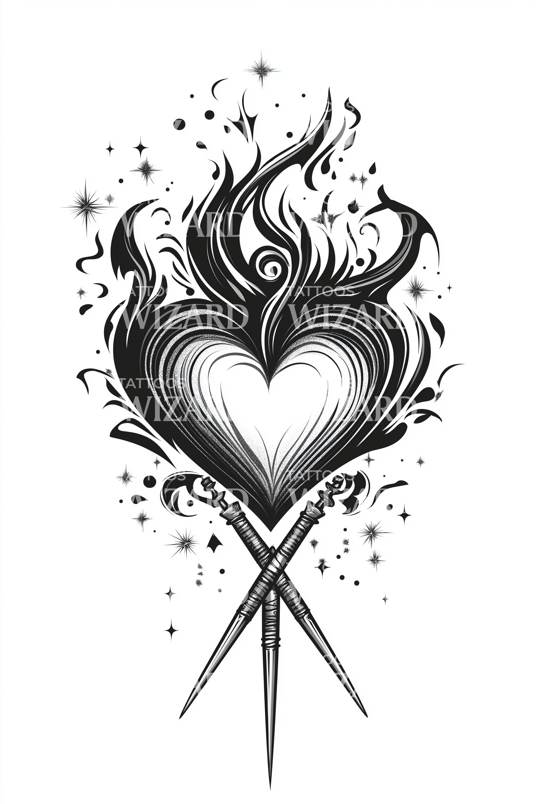 Blackwork heart rises in wildfire curls, rimmed with barbed shadows and star-spark embers. Crossed spikes anchor the blaze, echoing vows that love is both weapon and refuge. Symbolizing guarded passion and resilient romance, this design wraps the wearer in fierce tenderness, edgy courage, untamed heat and devotion.