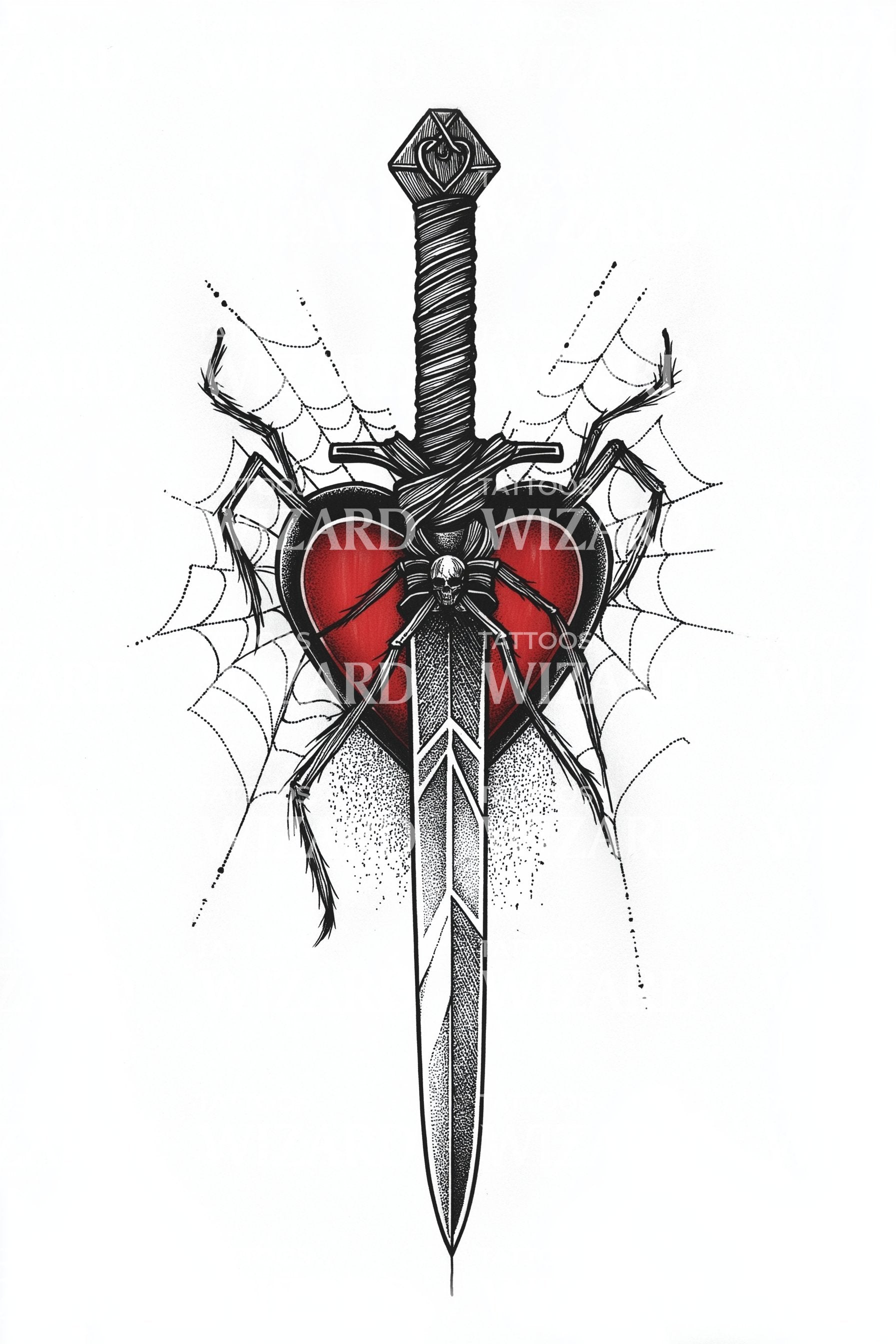 沉浸于这款黑灰纹身设计所讲述的戏剧性故事。描绘了一颗被剑刺穿的破碎之心,生动展现了痛苦与激情的原始情感。专为热爱强烈对比与叙事的你打造,这款设计揭示了爱情的美丽痛楚,融合了戏剧性与温柔。