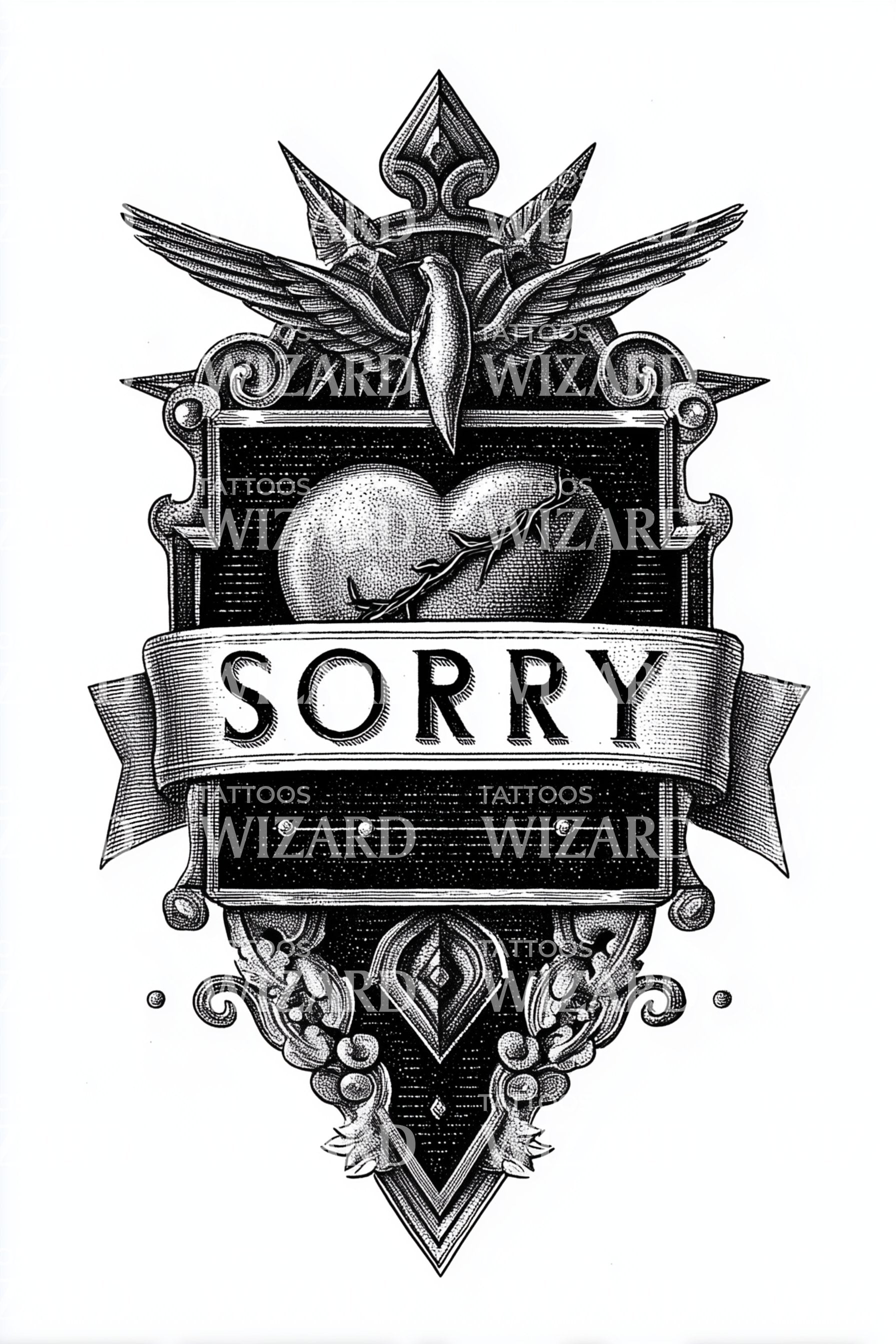 拥抱遗憾之美,这款装饰性纹身设计将心形与盾牌融合,配以纹章式装饰,表达真挚的歉意。每一笔都回响着“对不起”,描绘出悔恨的徽章。这不仅是一件视觉艺术,更是宽恕与优雅的强大象征。