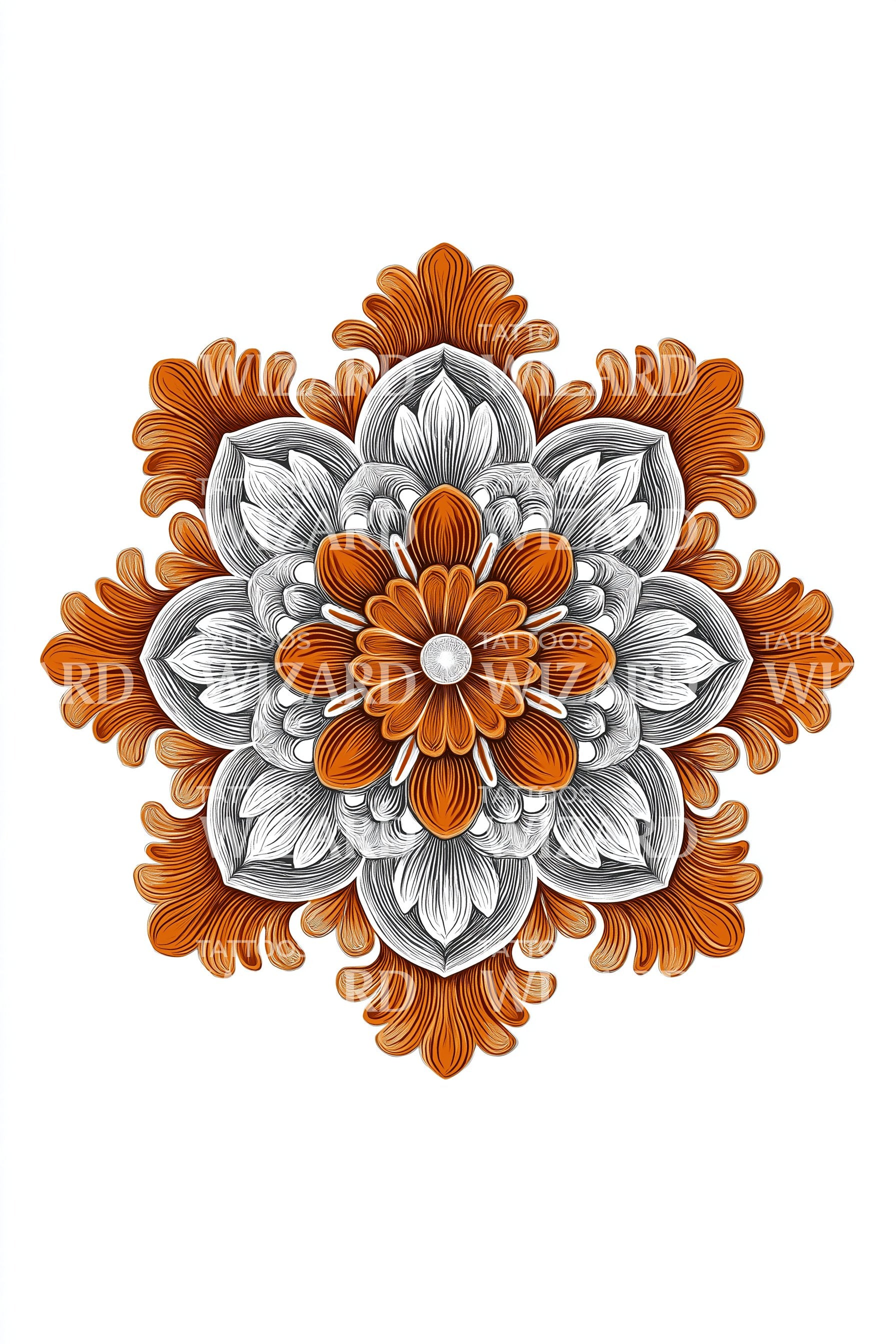 揭示您独特的风格,尽在我们迷人的曼陀罗纹身设计中,饰以精准的对称和引人入胜的图案。此设计呈现出引人注目的六边形构图,交织着精致的花卉元素,并以鲜艳的橙色点缀——完美融合,彰显您的魅力与个性。