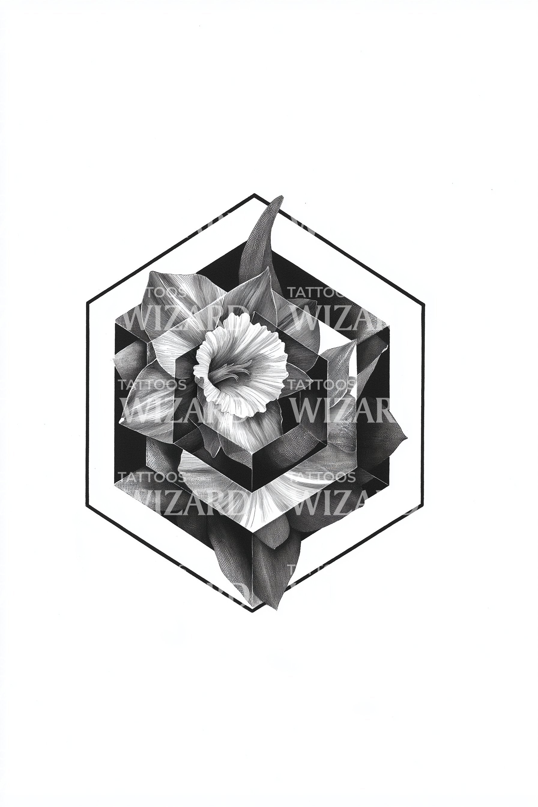 沉浸于几何与自然独特融合的这款惊艳单色纹身设计。无色六边形与中心精致的黑玫瑰交织,形成引人入胜的对比,散发出鲜明优雅的气息。这款几何设计真正彰显了简约与对比之美。