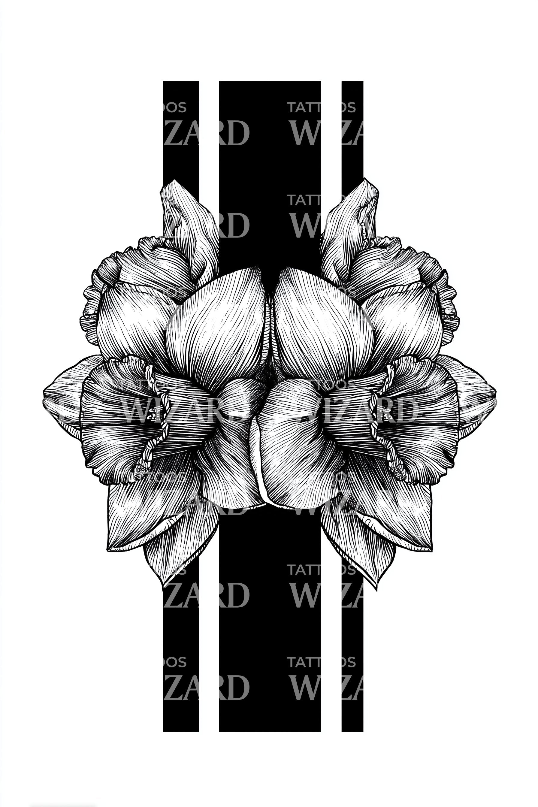 沉浸于这款单色黑纹身设计的鲜明对比中。粗犷的条纹为细腻描绘的扶桑花营造出引人注目的背景,展现出男性与女性气质的奇妙融合。这是一件迷人且永恒的作品,象征着美丽与力量。