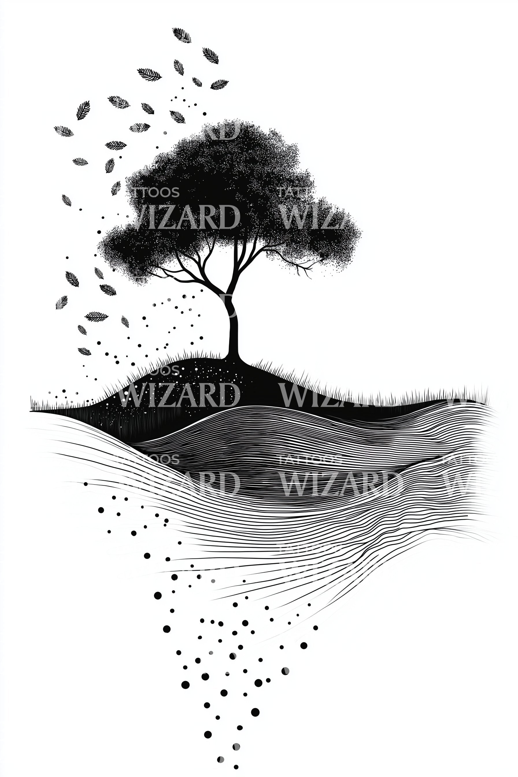 A tree on a lone hill, holding the whole landscape like a promise you refuse to break. Birds drift where certainty used to be, dissolving into particles, teaching surrender without defeat. Drawn to the quiet defiant, the ones who root deep yet let go. Let the wind sign your name.