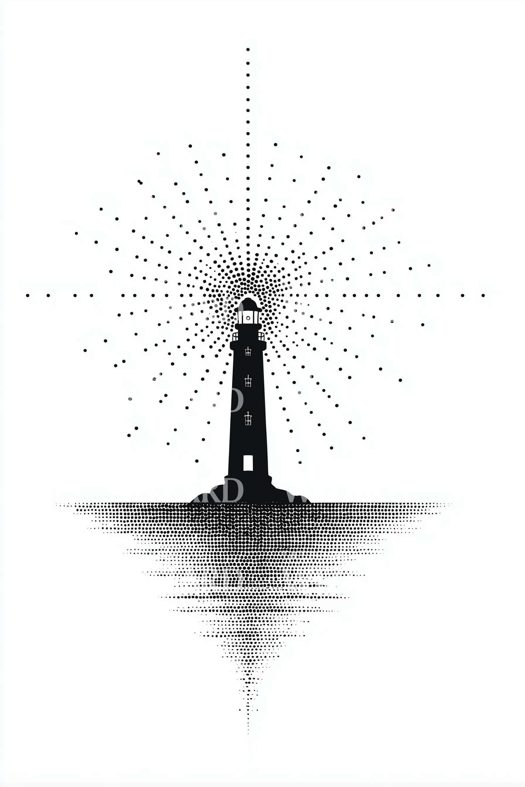 Lighthouse rising in crisp silhouette, crowned by a halo of dotwork radiance spreading like constellations, mirrors into the sea as a soft, tapering reflection. Symbol of guidance, resilience, and hope, the beacon’s glow cuts through inner storms, gifting the wearer calm direction, steady courage, and quietly luminous belonging.