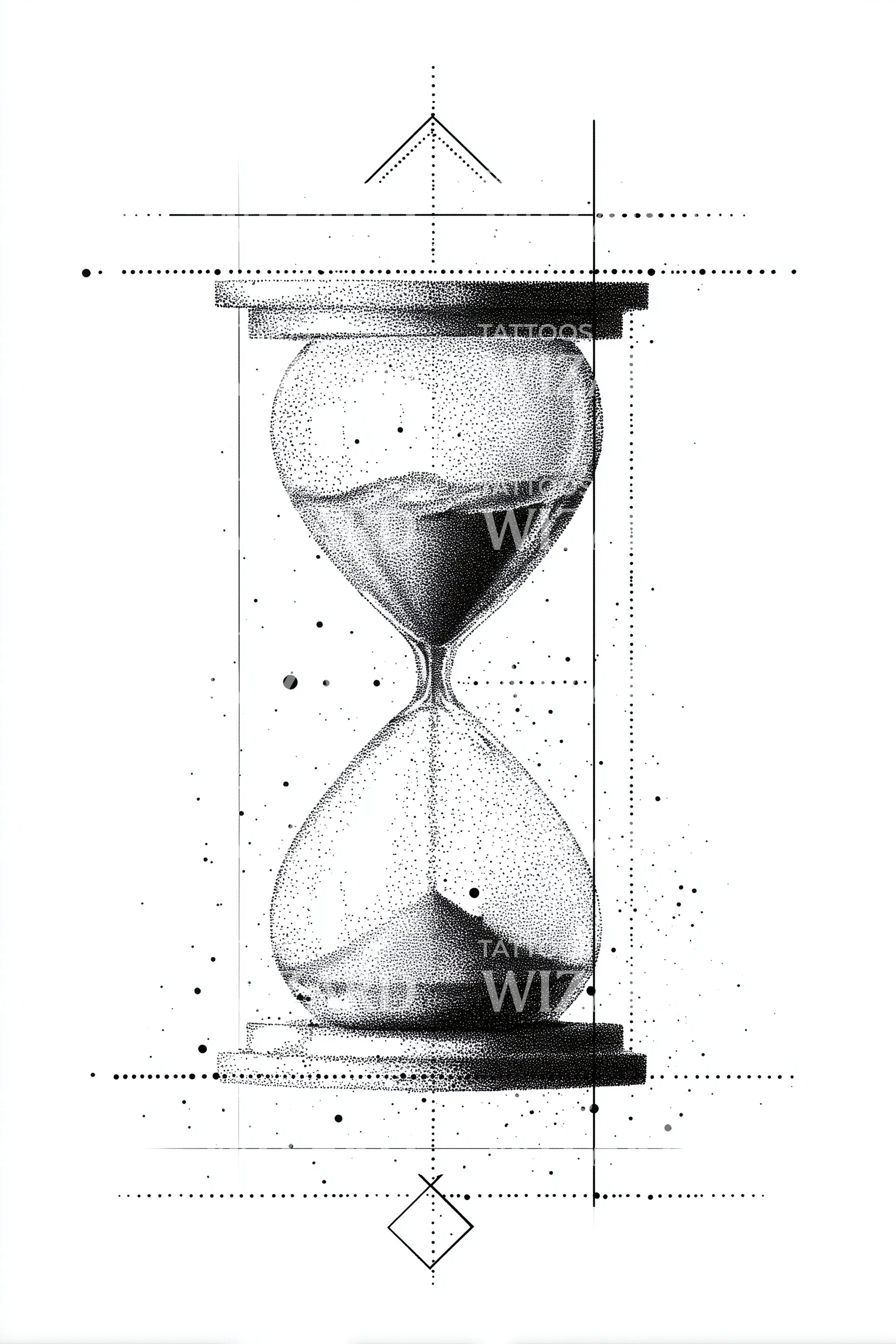 Minimal hourglass in crisp dotwork, framed by fine geometric lines and drifting ink grain. Sand hovers mid-fall, a quiet audit of moments. Symbol of presence, impermanence, and deliberate pace. Worn on skin, it whispers calm focus, modern clarity, and the courage to savor now, with every measured breath.