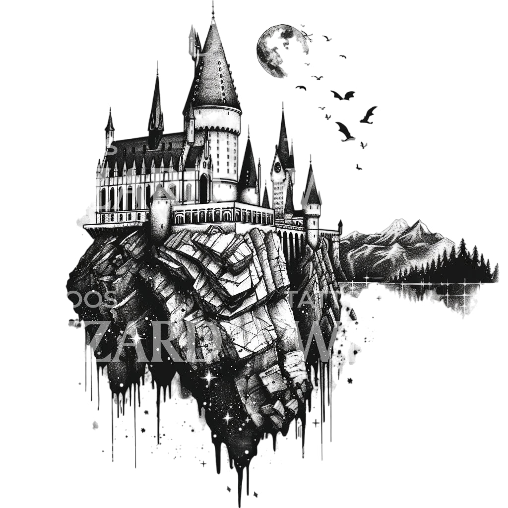 沉浸在魔法的魅力中,欣赏这款复杂的哈利·波特主题纹身设计。展示了标志性的霍格沃茨城堡的惊艳黑灰点刺画,这件作品体现了魔法学校的魅力。释放你内心的巫师,向女巫和巫师的世界致以这份迷人的致敬。