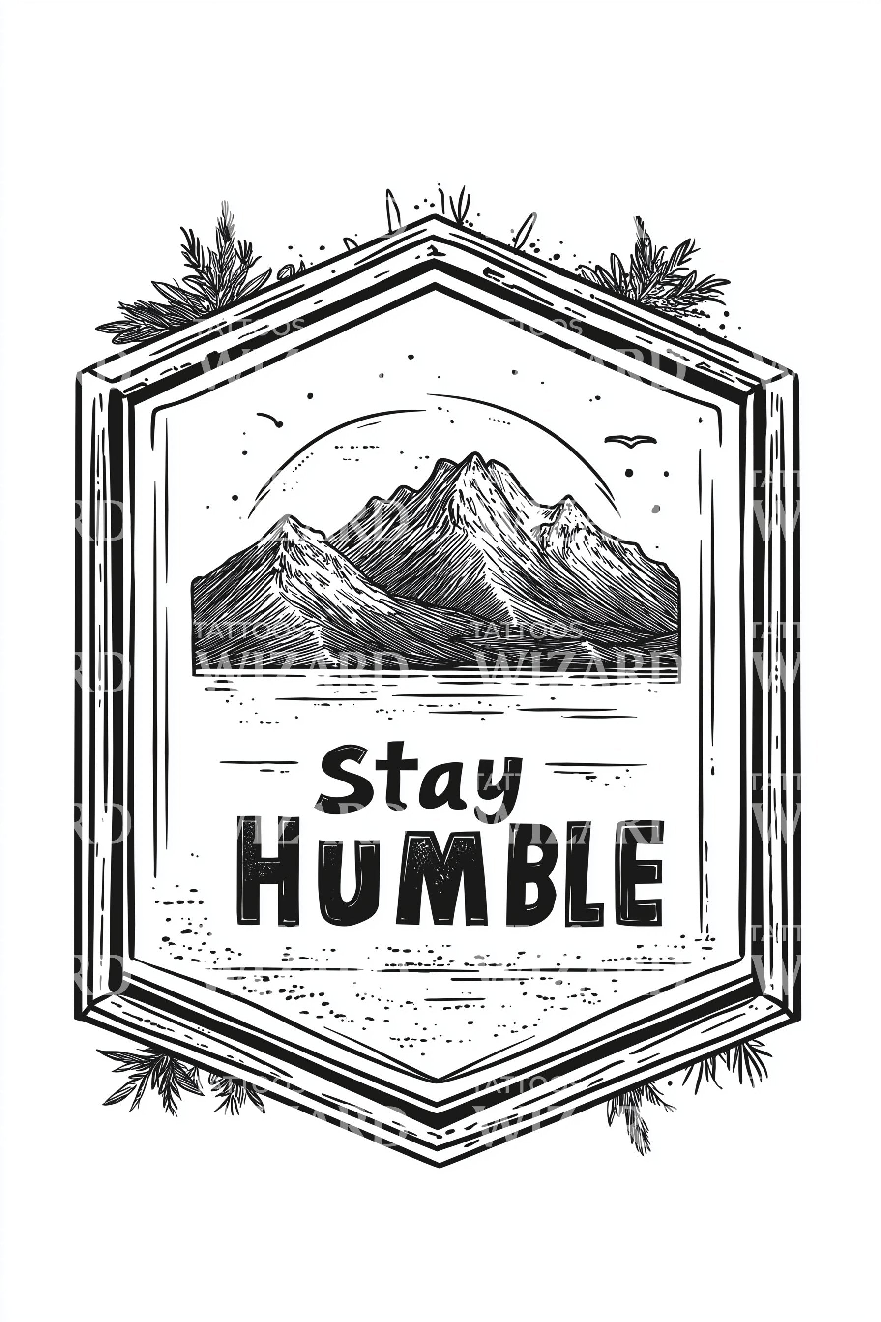 Neotraditional emblem etched like a woodcut: bold hexagonal frame, pine sprigs, arcing sun, and rugged peaks above the command Stay Humble. Mountains stand for virtue earned through ascent; the badge honors quiet strength and adventure. Wearing it feels steady, grounded, and brave, a compass toward grace and wonder.