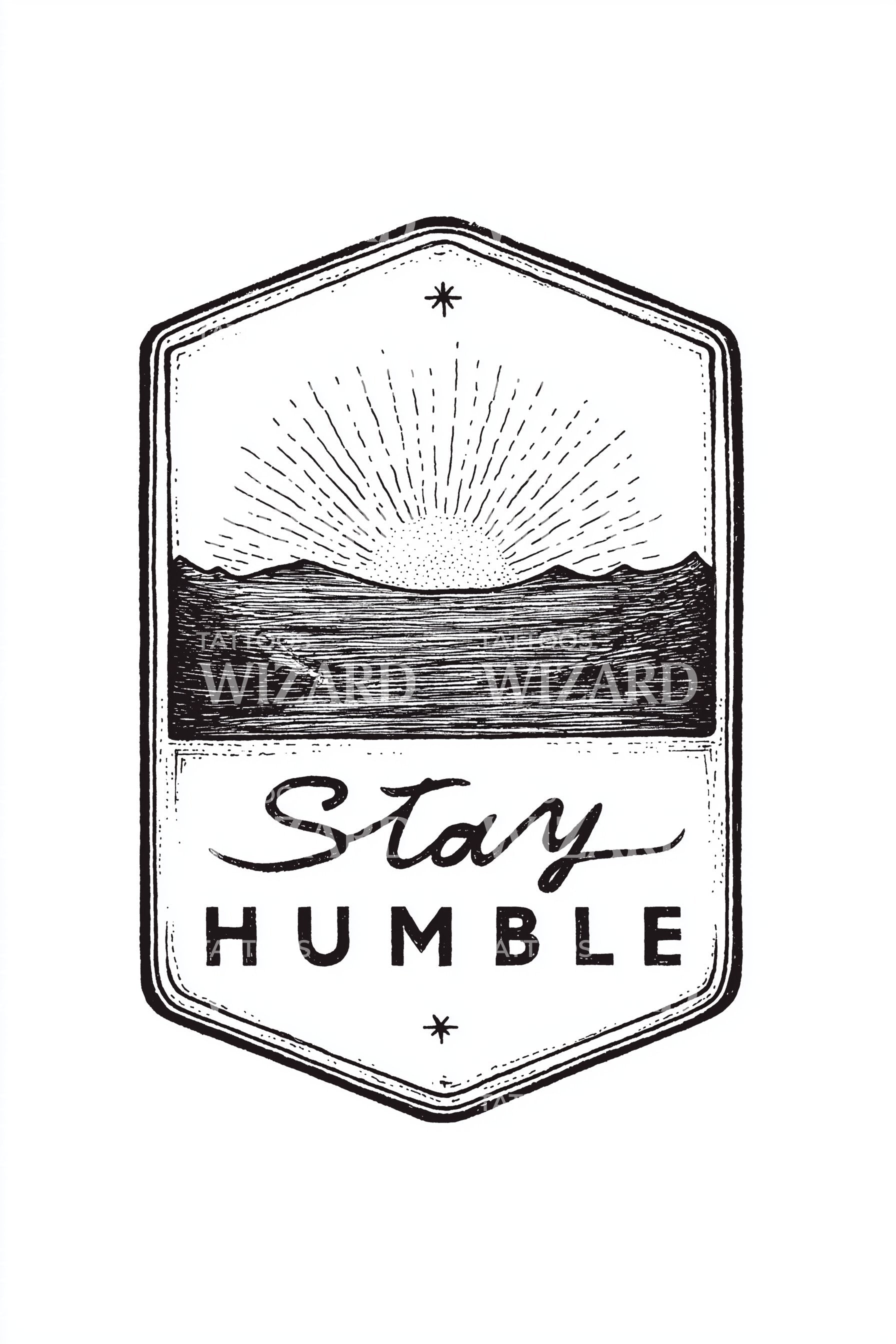 Fineline badge framing a sunrise over ridged mountains, rays fanning across a quiet sky; below, mixed script and block type declares Stay Humble. Monochrome ink feels like a travel tag for the soul, symbolizing hope earned through discipline. Worn daily, the design steadies, softens, and strengthens with humility.