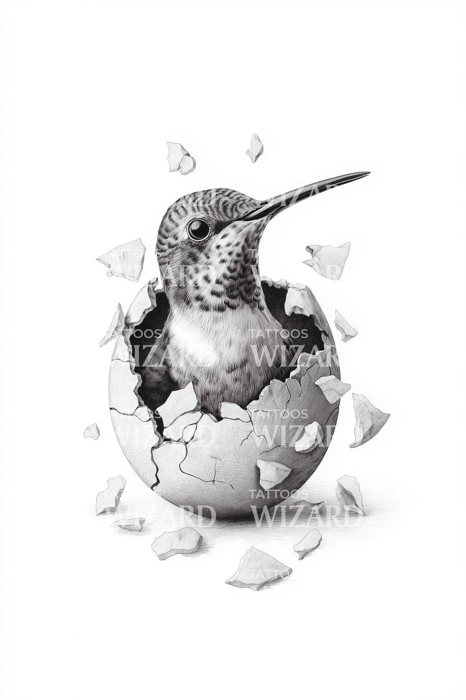 体验这款微写实纹身设计中大自然的美丽。它生动地描绘了一只刚刚破壳而出的雏鸟,一只色彩斑斓的蜂鸟见证了这一神奇时刻。这幅纹身艺术凝聚了生命、蜕变与优雅——如同鸟类世界令人叹为观止的真实写照。