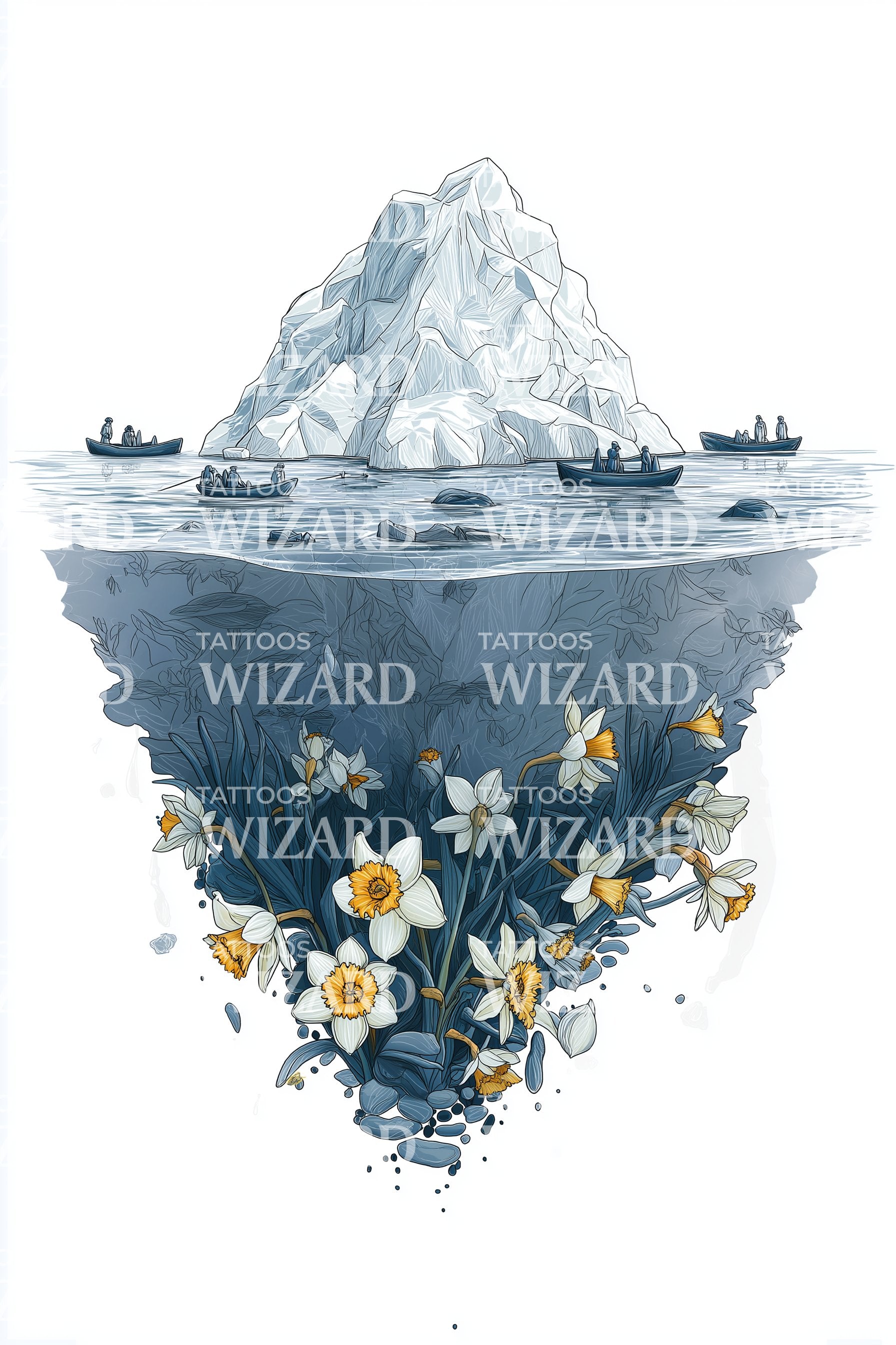 沉醉于北极的空灵神秘,这款水彩纹身设计巧妙融合了错综复杂的花卉图案与几何冰山。海洋的对比增添了迷人而梦幻的魅力,完美契合那些被自然元素魔力吸引的人。令人惊叹的对比之美的化身。