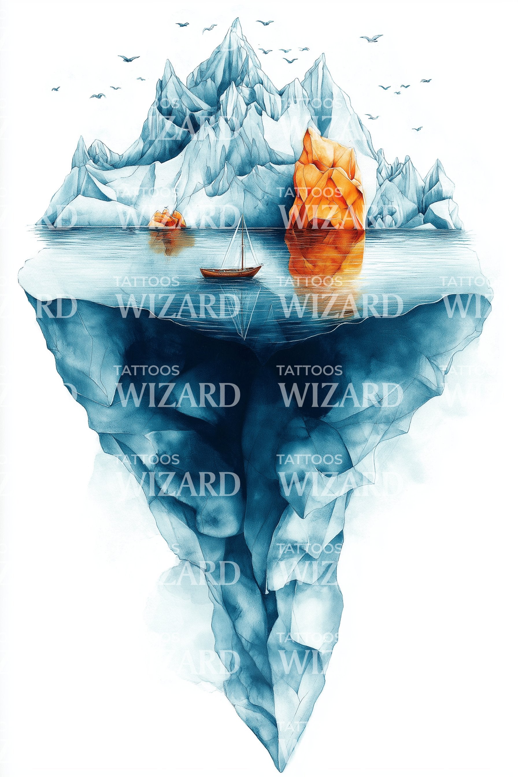 沉浸于美的深度,感受我们的水彩纹身,展现漂浮在蓝色海洋中的融化冰山。这款充满活力、流动感十足的设计捕捉了水彩艺术的奇幻本质,同时展现了冰冷海洋世界的原始力量与美丽。非常适合海洋爱好者和冒险者。