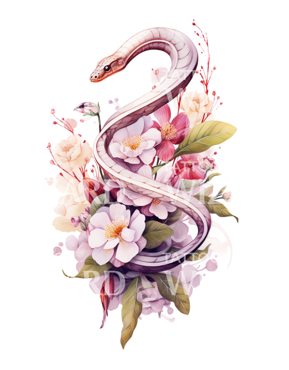 这个插图纹身设计完美地融合了现实主义和色彩。一朵生机勃勃的兰花占据了中心位置,而一条细致入微的环绕蛇则增添了迷人的边缘。非常适合那些被惊艳视觉和异域风情吸引的人。是您肌肤上的真正艺术声明。