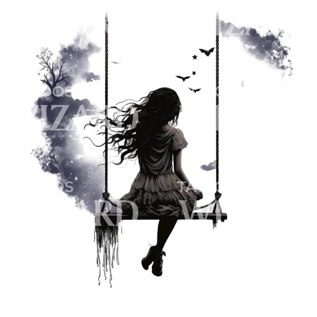 沉浸在我们插图纹身设计的梦幻美学中。这件作品讲述了一个奇幻的故事,一个古怪的女孩在云朵中顽皮地荡秋千,身边伴随着她忠实的蝙蝠。这是神秘与欢乐的迷人结合,形成了独特的纹身声明。
