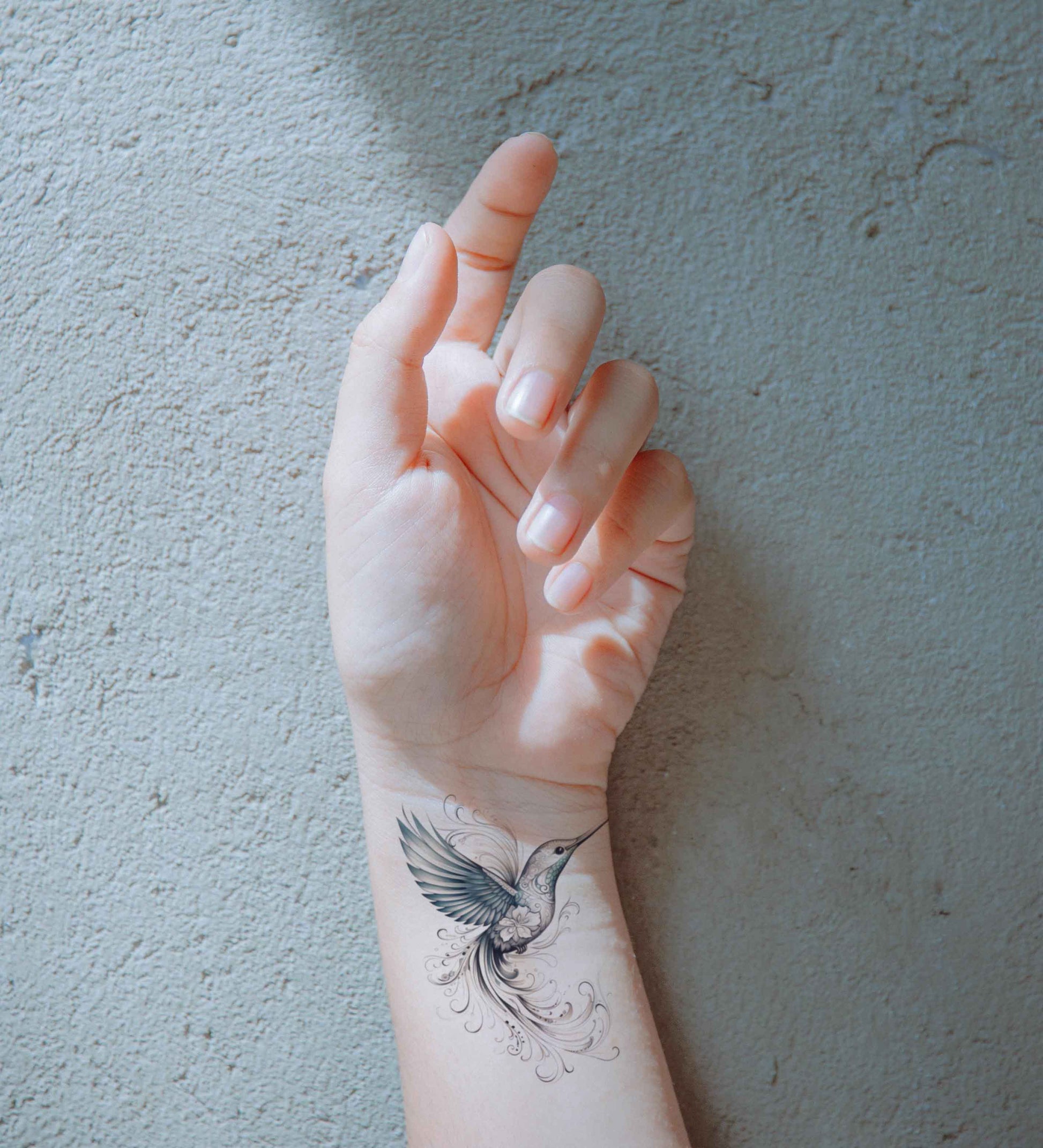 沉浸在这个插图蜂鸟纹身设计的纯粹美丽中。精心制作,展现出鲜艳的色彩,体现了大自然飞翔的宝石的细腻魅力。这个设计可以将你的肌肤变成一个迷人的画布,吸引每个人的目光!适合自然和艺术爱好者。