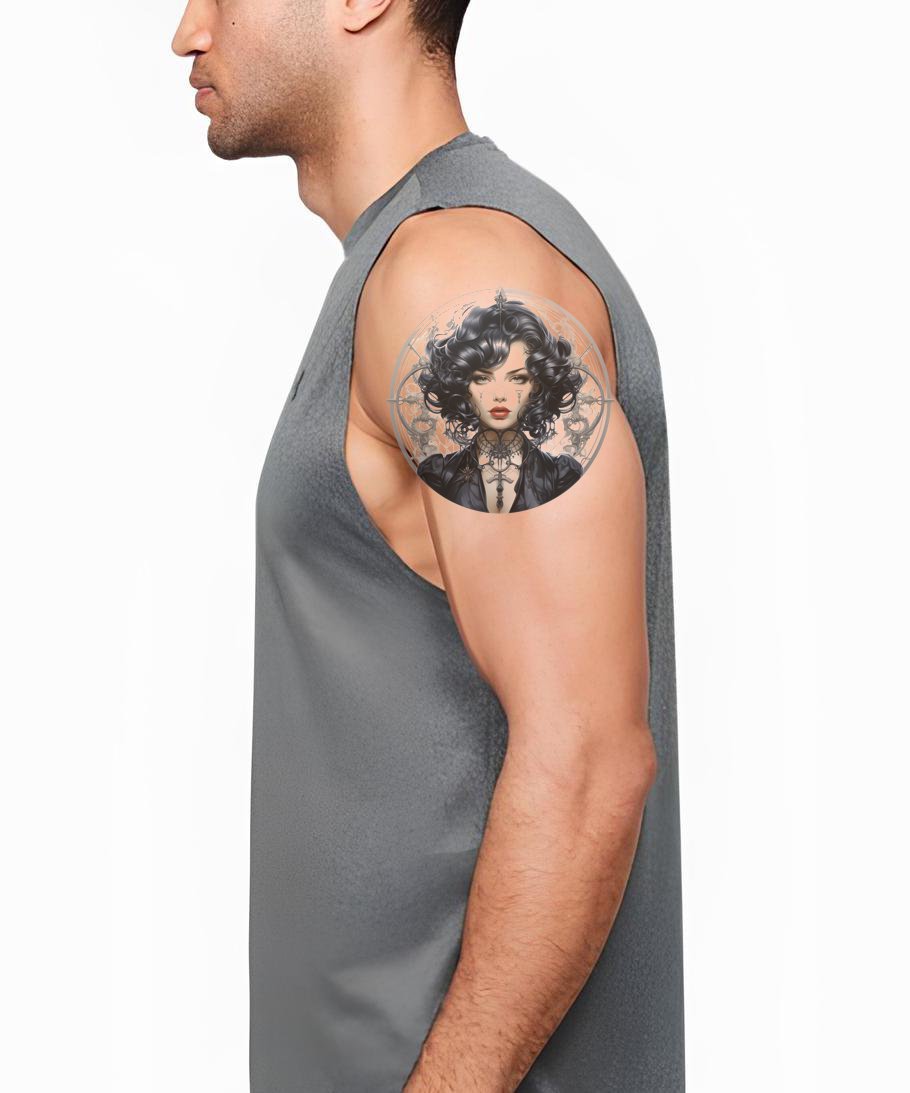 释放你内心的黑暗面,尽情欣赏这款迷人的哥特风格纹身设计。这件作品展现了一位神秘女性的肖像,巧妙地与可怕的蜘蛛交织在一起。非常适合万圣节或那些拥抱阴森的人,这个设计承诺将成为你纹身收藏中的独特补充。