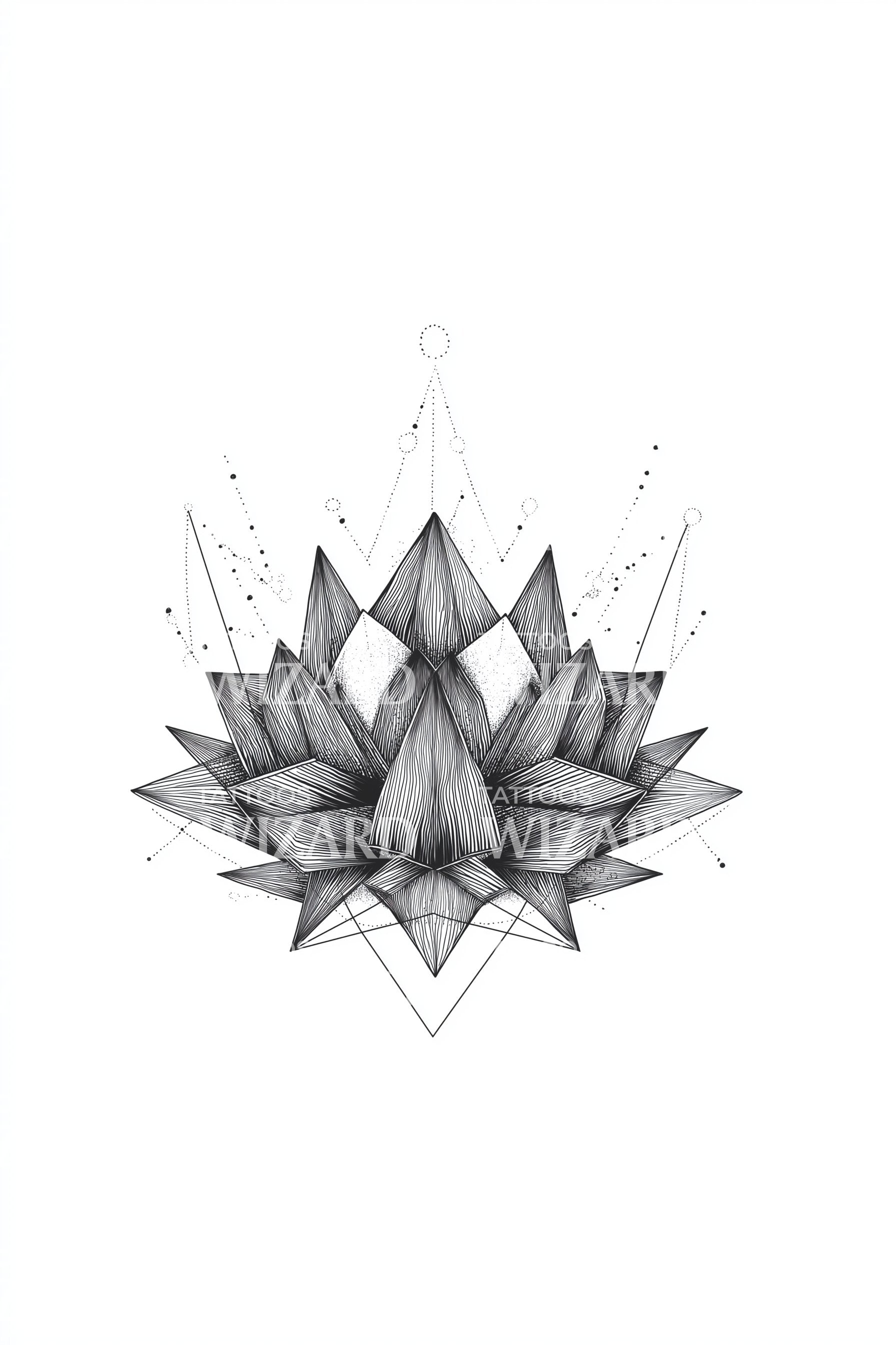 Architected in black&grey, a faceted lotus unfolds amid geometric lines and celestial dotwork. Layered petals carve depth, whispering indigo calm and steady breath. Symbol of rebirth and clarity, the bloom rises from shadow. Wearing it feels grounded, quietly luminous, and beautifully floral through every mindful step each day.
