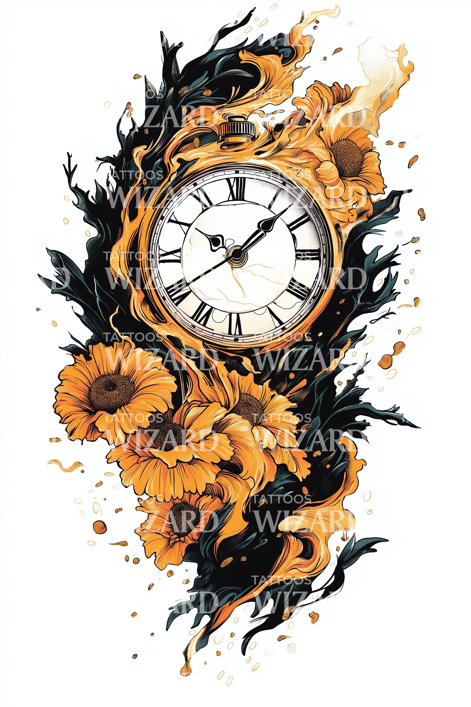 体验这款新学派纹身设计中旧与新的融合。它巧妙地将象征能量与激情的明亮万寿菊,与象征流逝时光的炽热燃烧的时钟并置。沉浸于它的火焰,让其象征点燃你的灵魂。