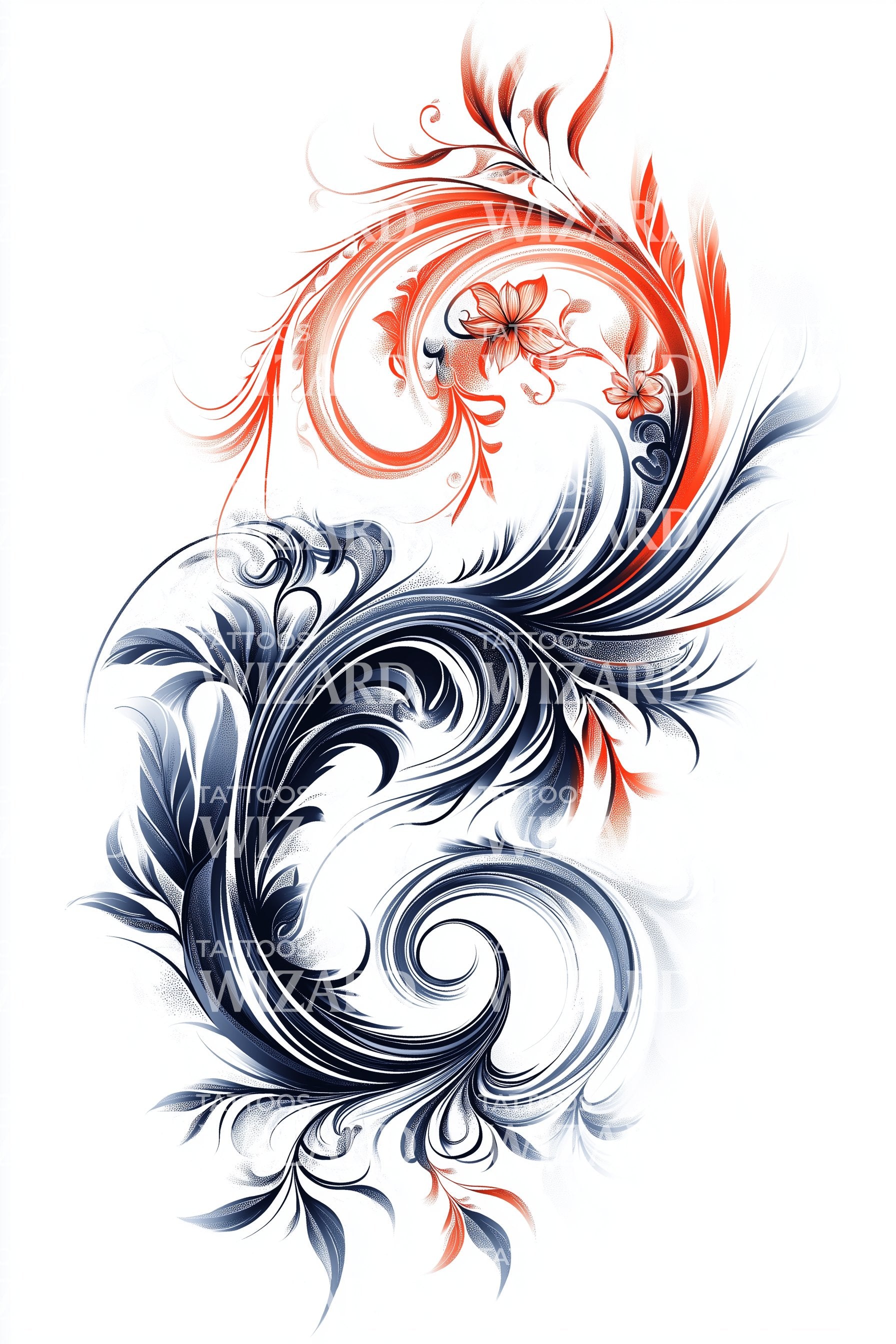 用这款华丽的纹身设计点燃你的风格;它象征着一只在烈焰之心中诞生的凤凰。每一笔细节都精心雕琢,以强化火焰主题。装饰性的旋涡宏伟地模仿了火焰迷人的舞蹈。这不仅仅是一个设计;它是你个人无拘无束重生的盛典。