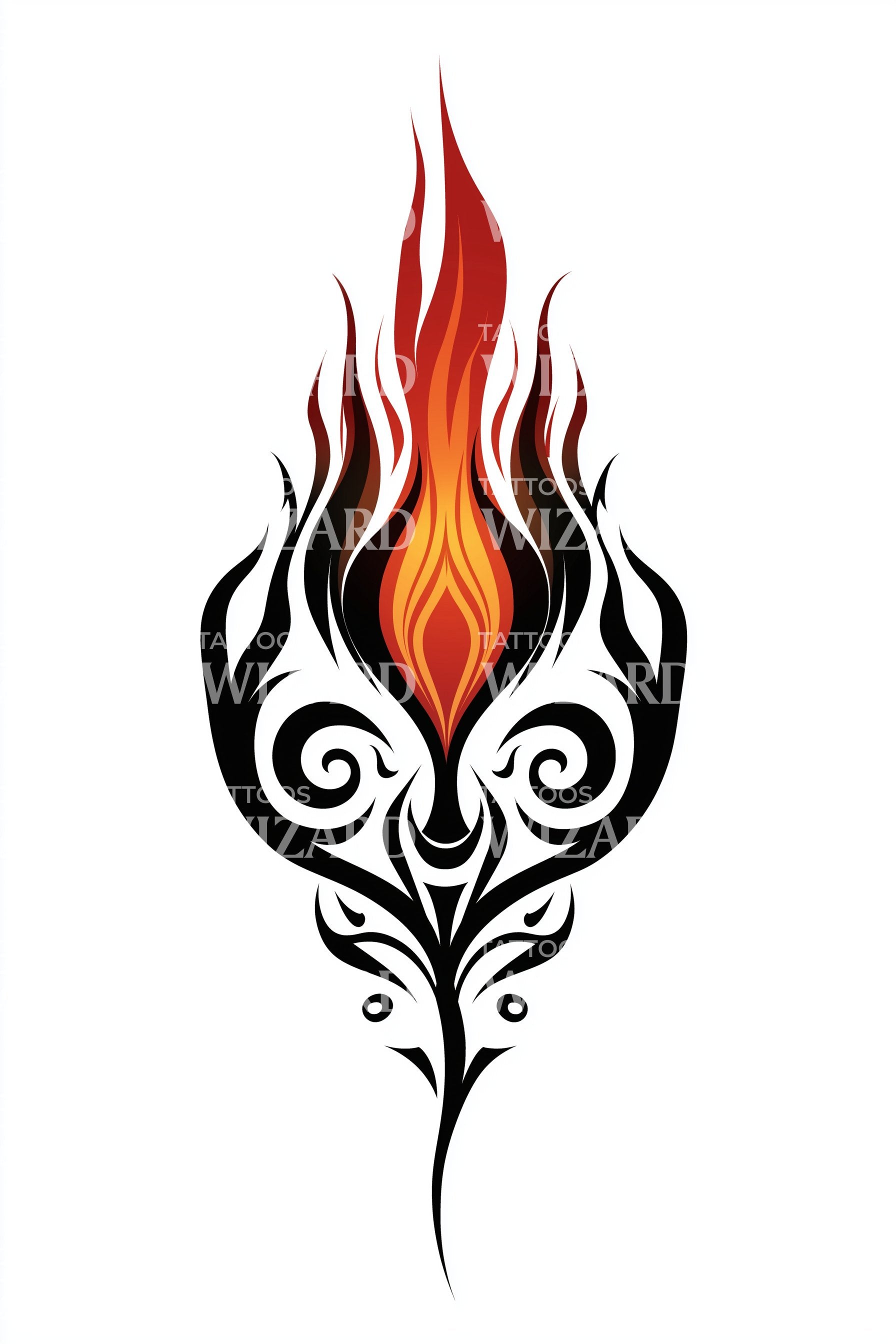 Blazing tribal sigil of curled black lines cradling a red-orange flame, sharpened points and spirals rising in perfect symmetry. Fire symbolizes rebirth, courage, and relentless energy, a torch for the spirit. Wearing it feels bold and edgy, like carrying your own ignition, steady heat guiding fearless moves forward.
