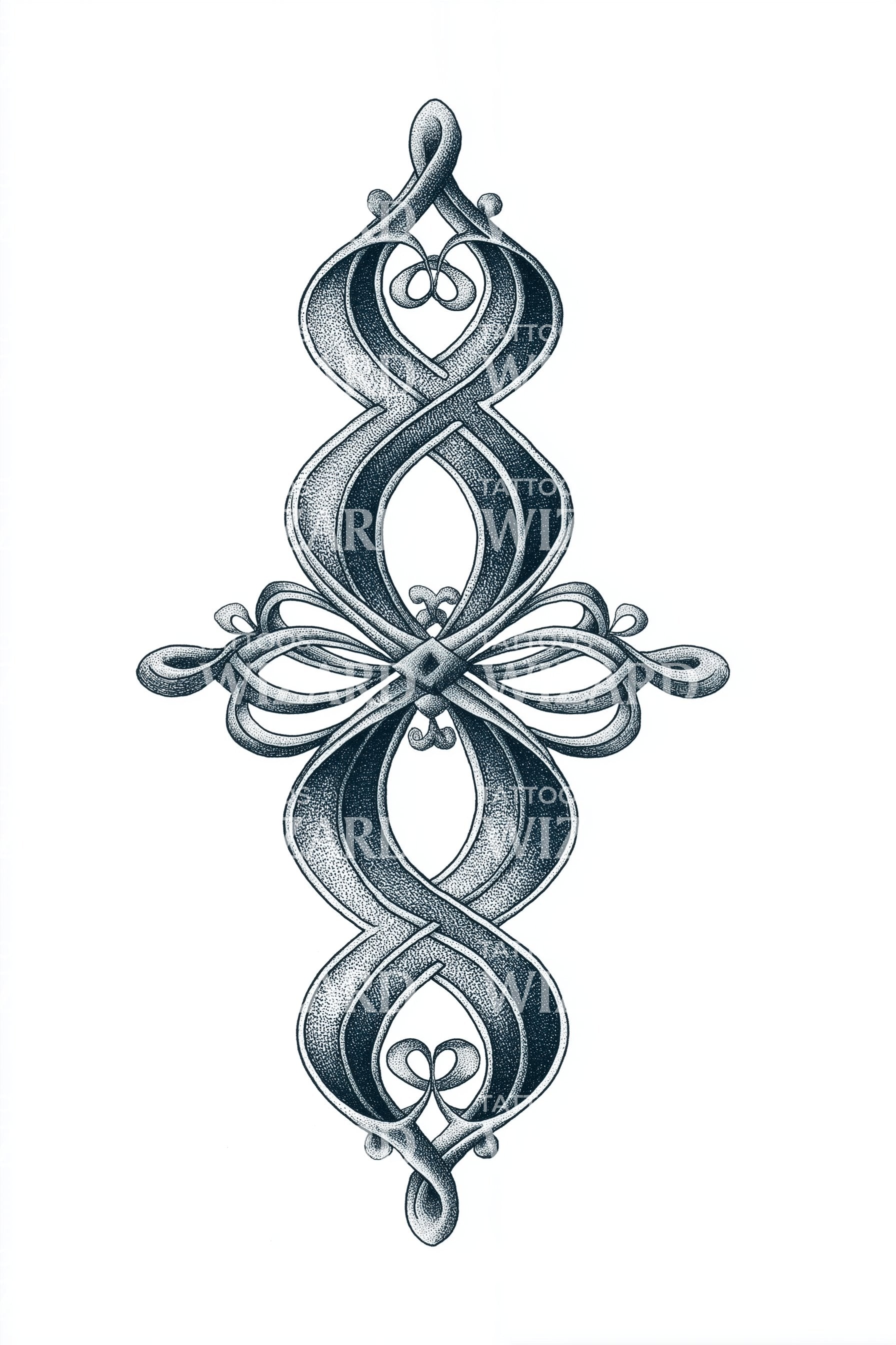 Flowing blackwork ribbons weave a mirrored figure-eight, shaded with fine stipple and crowned by a central ornamental knot. The endless loop speaks of infinity, eternity, balance, and returning cycles. Wearing it invites steady breath, calm momentum, and unwavering grace, a personal talisman of continuity and evolving strength.