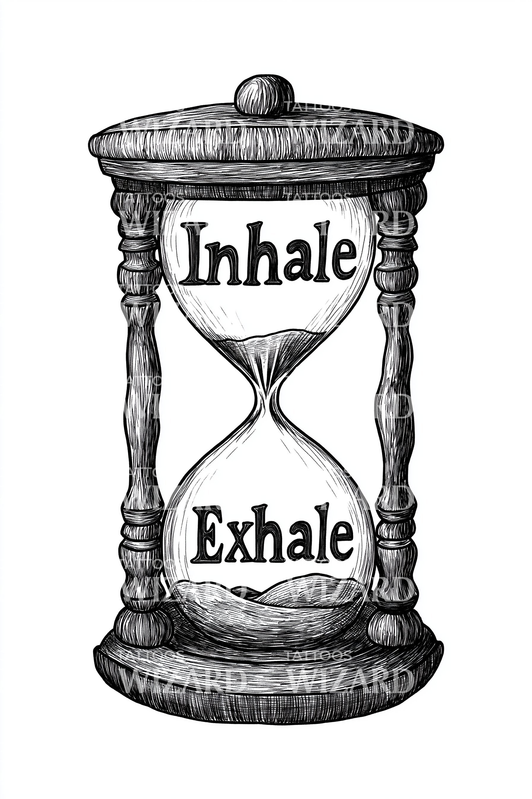 A finely etched black&grey hourglass frames bold Inhale and Exhale, its woodgrain pillars and glass gleam with meticulous shading. Sand measures breath and time, teaching balance and presence. Wearing it feels calm and grounded, a quiet metronome for choices, endings, beginnings, and the sacred rhythm of living.