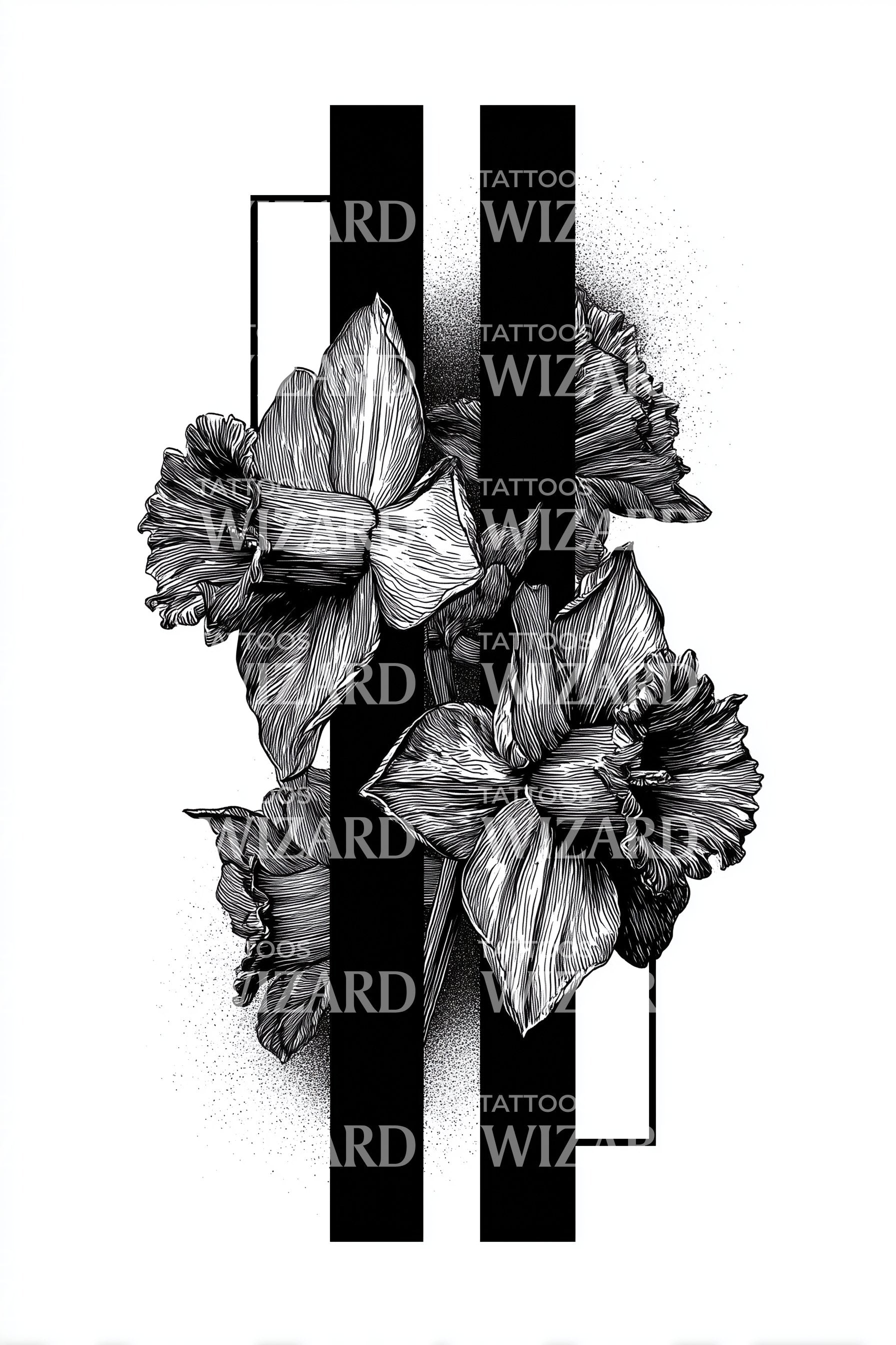 见证对比的内在戏剧性与现代魅力在这款黑色纹身设计中的完美融合。作品大胆地将花卉元素与刚硬的杠杆风格美学结合,创造出自然与工业的艺术碰撞。浸润于浓墨之中,设计散发出大胆且毫不妥协的魅力。非常适合现代身体艺术爱好者。