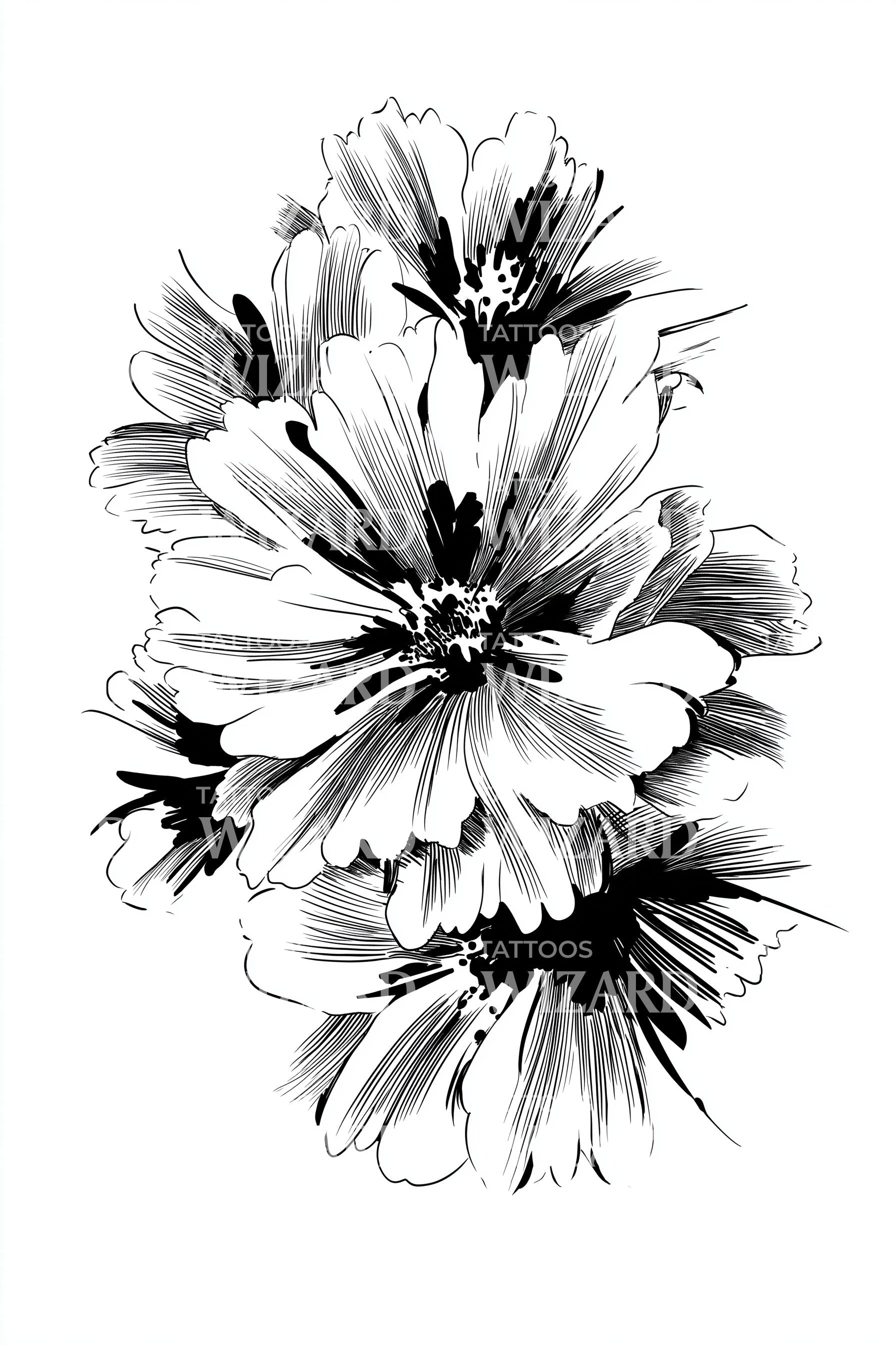沉浸于这款黑色纹身设计的迷人魅力中。通过大胆而富有戏剧性的墨迹笔触,它精彩地描绘出一朵绚丽的花朵。鲜明的对比进一步提升了设计,使其成为大自然最美丽形态的壮丽呈现。