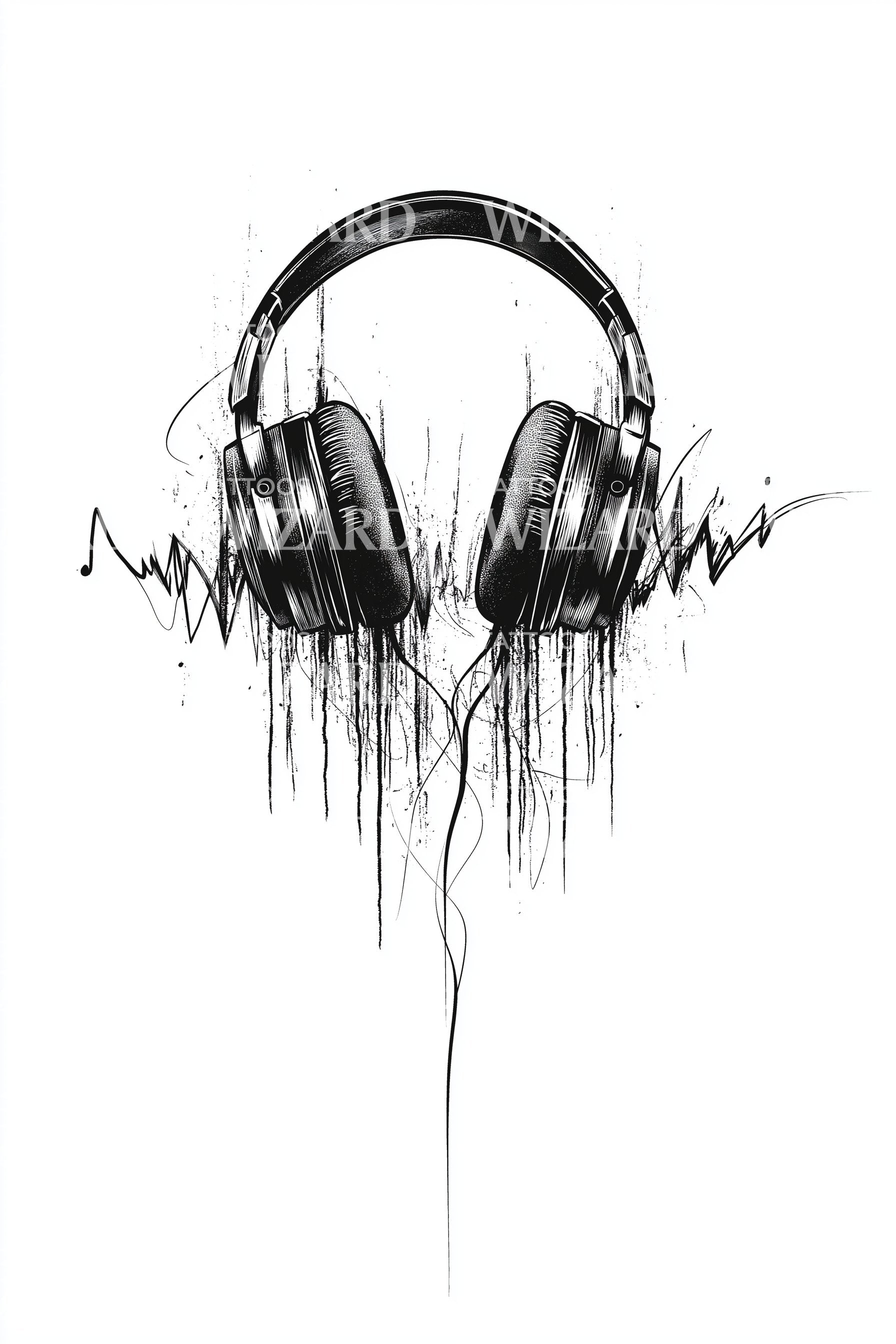 Blackwork headphones bleed ink, halo of linework with ink drip and jagged sound waves. Symbolizes living in music, letting noise dissolve into clarity. Wearing it feels grounded, tuned to vibes. Ideal on forearm for vertical cord flow; calf for stride rhythm; spine for resonance; upper arm for presence.