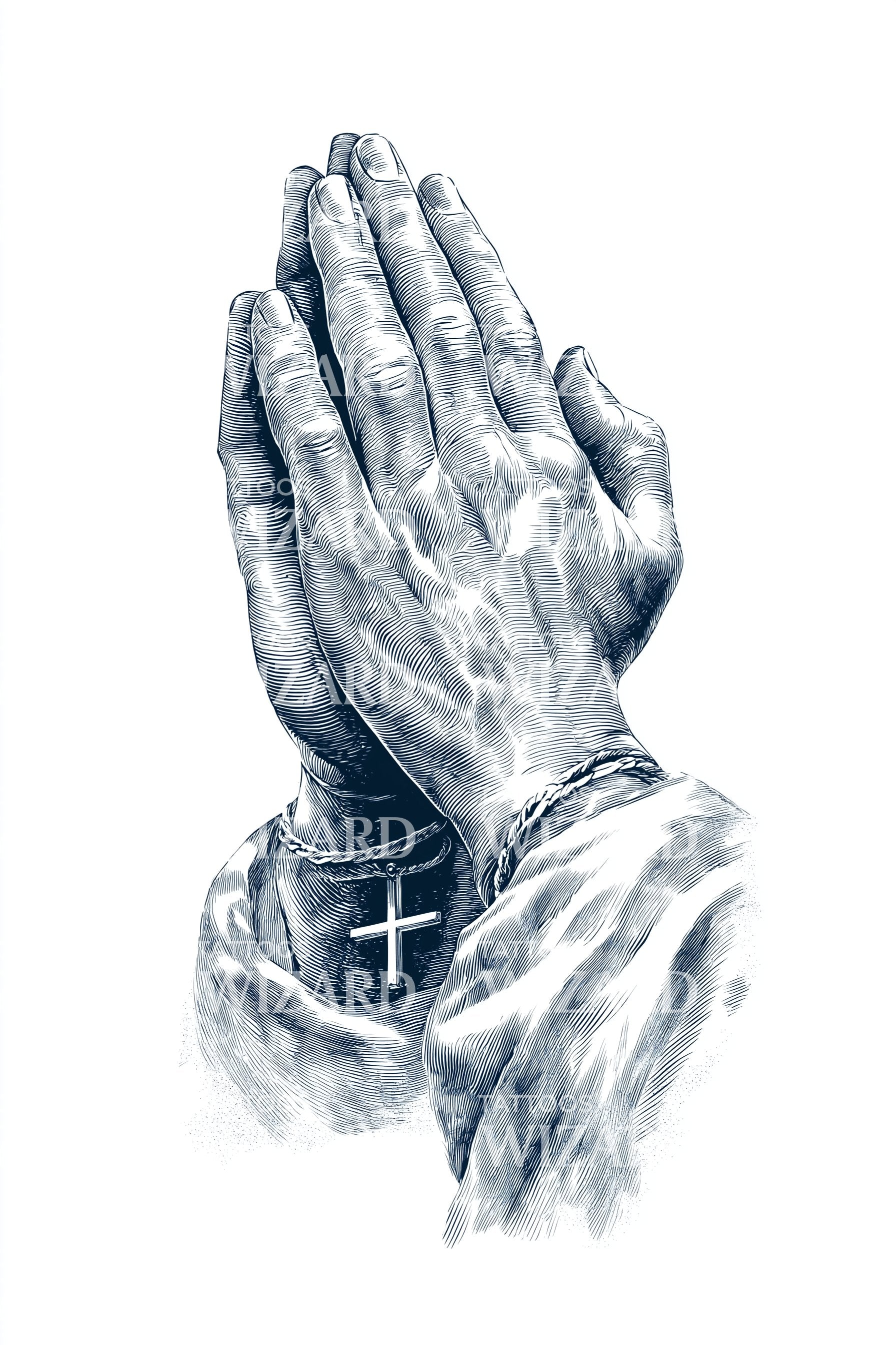 以这款引人注目的黑灰纹身设计拥抱你的信仰,突出表现了双手合十祈祷,紧握着显眼的十字架。蓝色墨水的点缀增强了精神主题,提升了视觉吸引力。这件作品完美象征了虔诚与坚定的信念,为精神连接者带来感人至深的共鸣。