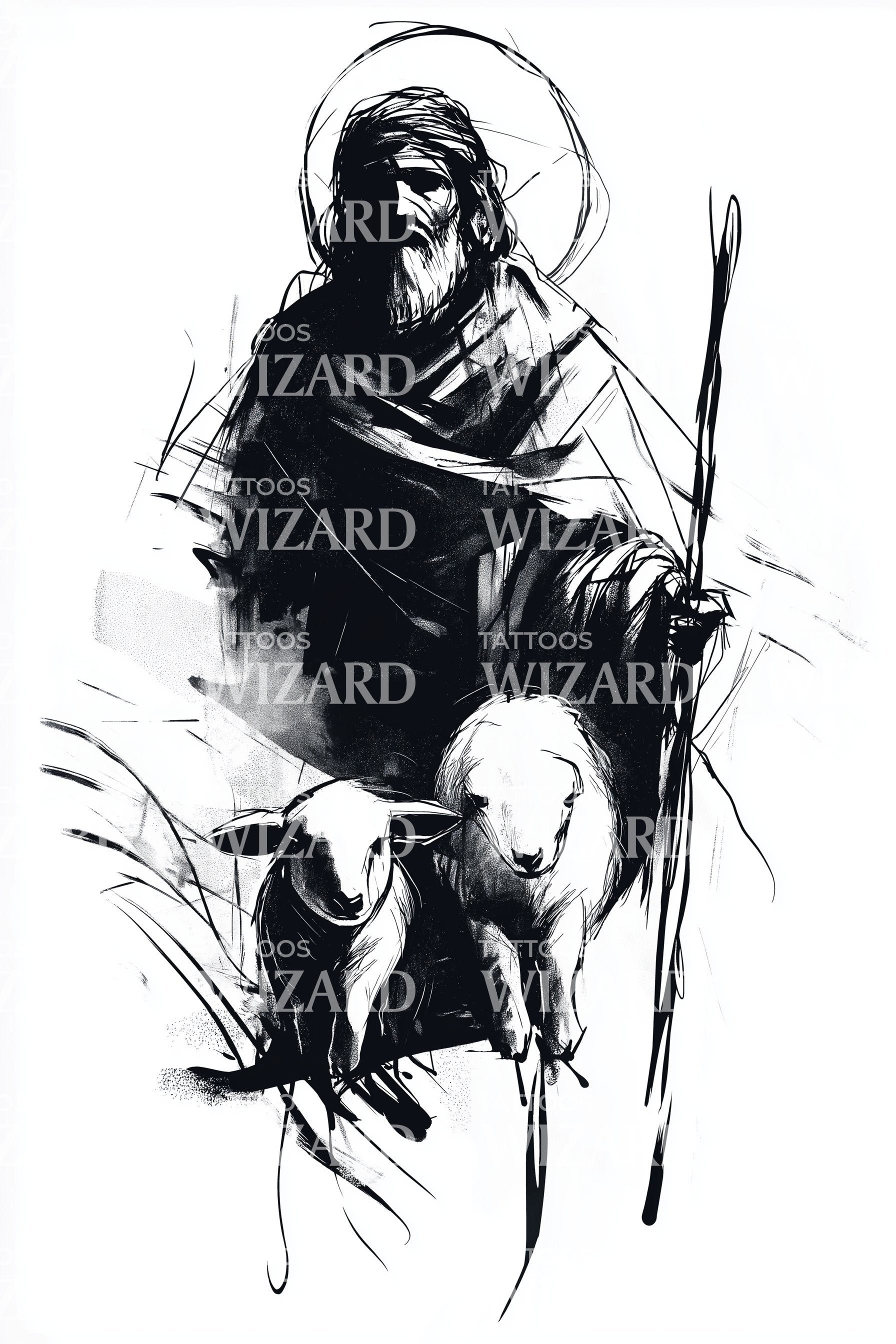 体验这款牧羊人纹身设计所带来的深刻信仰之旅。这是一幅描绘牧羊人手持牧杖的墨迹素描,象征着引导与保护。这件艺术作品捕捉了坚韧与精神指引的本质,是您个人信仰旅程的理想象征。