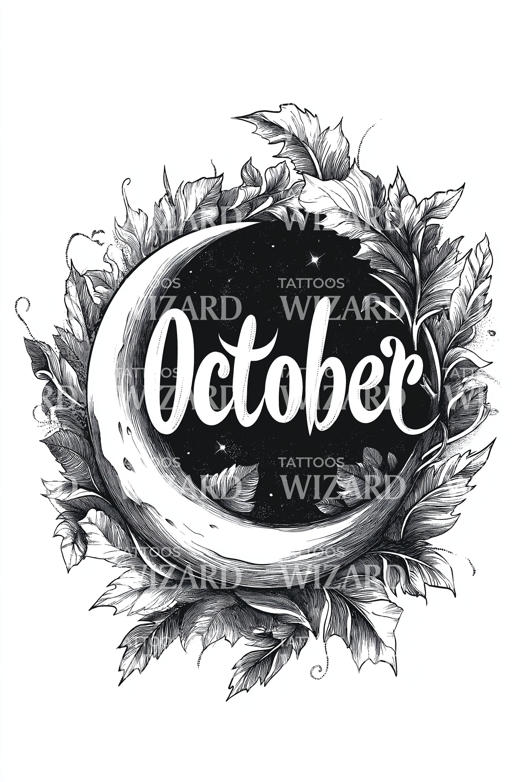 October moon cradles bold script within a star-salted sky, ringed by etched leaves and gentle ink splash, a brush-drawn grunge halo. Crescent and foliage symbolize cycles, release, and renewal. Wearing it feels hushed and brave, a night whisper reminding the heart to transform, harvest wisdom, and glow.