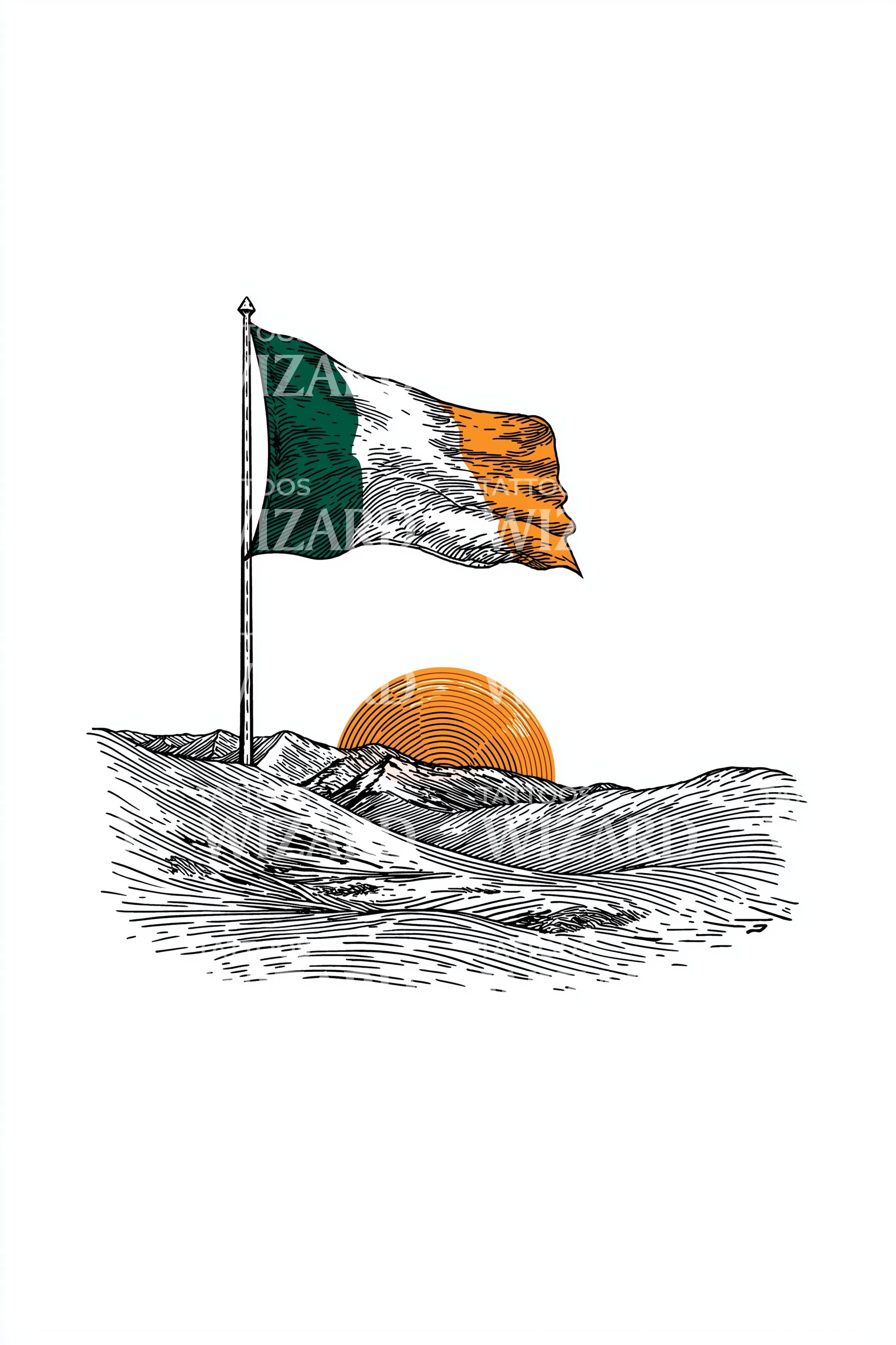 用这款素描风格的纹身庆祝爱尔兰的精神:崎岖的海岸线与大西洋相遇,夕阳映照出鲜艳的橙色和深绿色,呼应爱尔兰国旗。松散的铅笔笔触、细腻的阴影和流畅的线条,营造出动感、怀旧与海岸自豪感,成为永恒的象征。