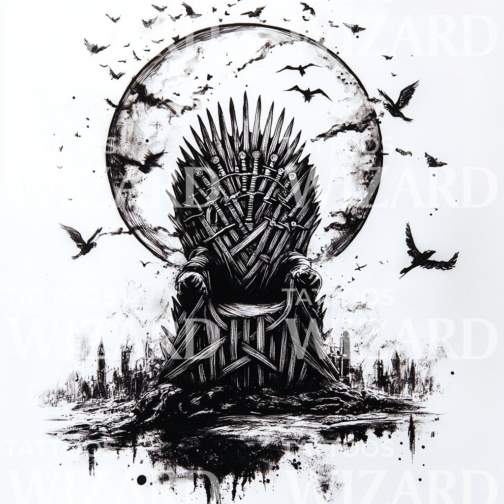 沉浸在权力与威严的世界中,这款黑灰色纹身设计展现了一个精心制作的铁王座,周围环绕着威严的剑和警惕的乌鸦。这件作品完美地体现了国王统治的黑暗魅力——对于追求主宰与神秘的人来说,绝对是必备之物。