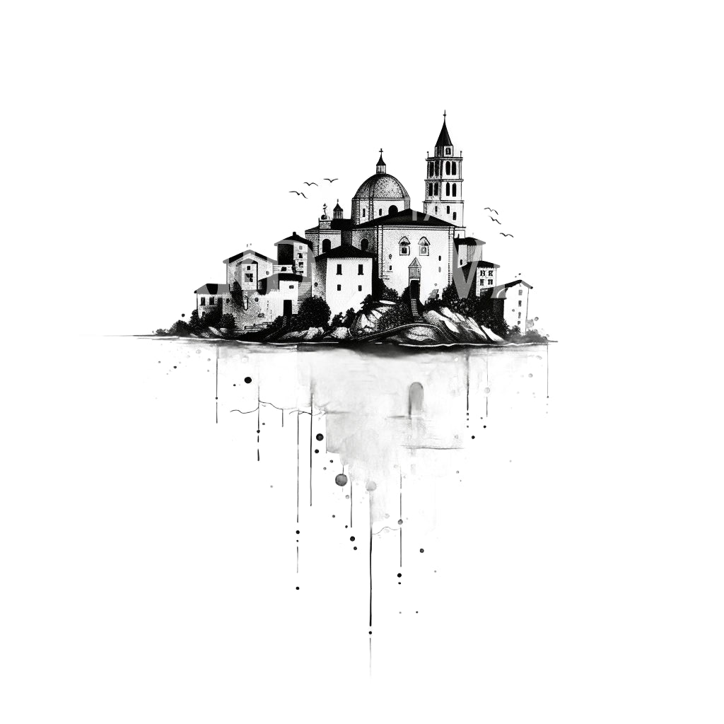 用这个黑灰色的极简主义纹身设计来沉醉于你对意大利的热爱。艺术作品捕捉了传统意大利村庄的宁静之美。圆顶教堂的特色增添了历史感,反映了这个国家丰富的建筑遗产。它非常适合那些欣赏细腻和优雅的人。