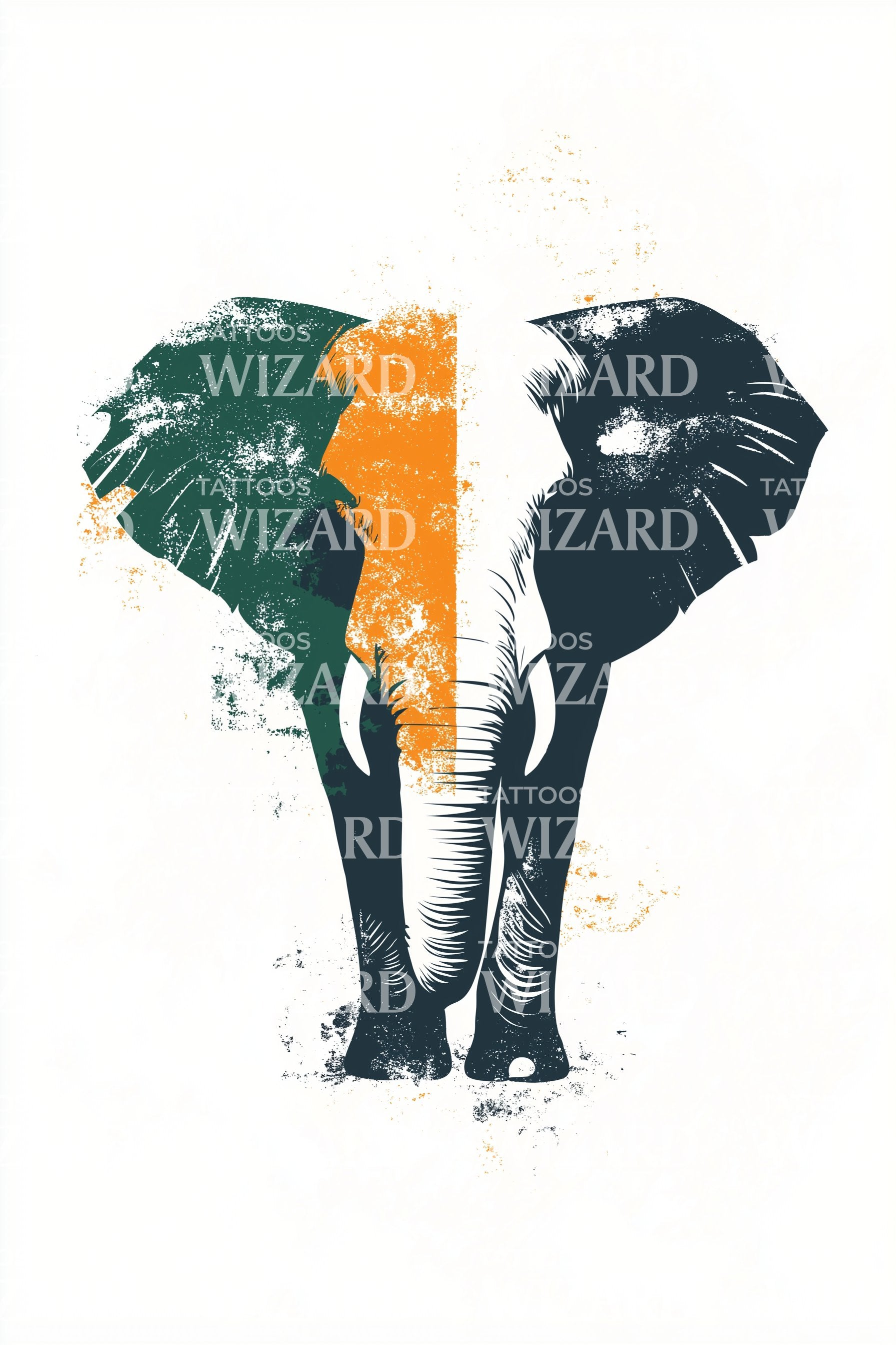 用这款水彩大象纹身设计庆祝科特迪瓦的精神。浓郁的绿色泼墨和鲜艳的橙色晕染呼应国旗,衬托出一只温柔而威严的厚皮动物。流畅的笔触唤起自由、传承与野生动物保护的意象——非常适合大胆、热爱自然的皮肤艺术,展现柔和的画意动感与层次感。