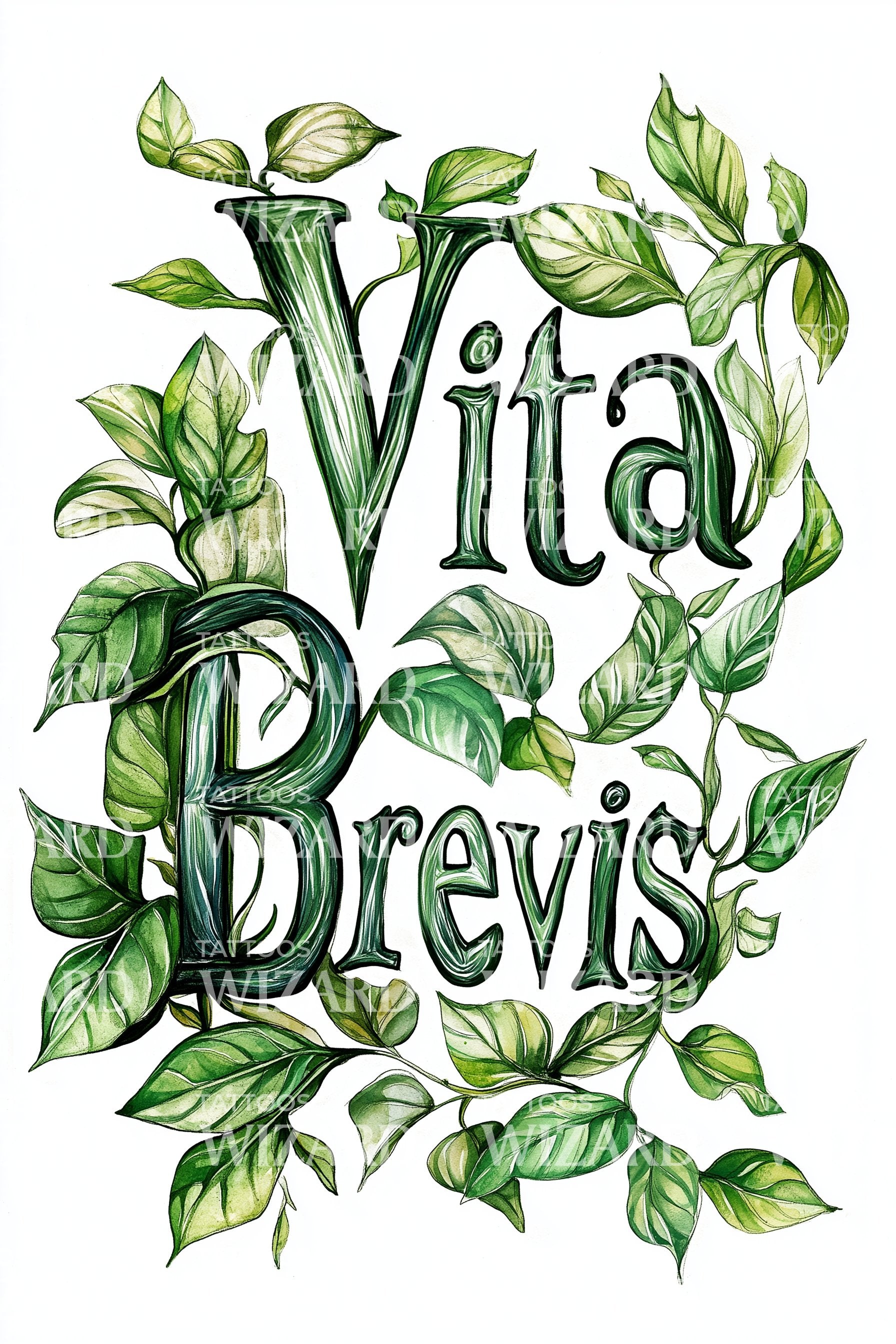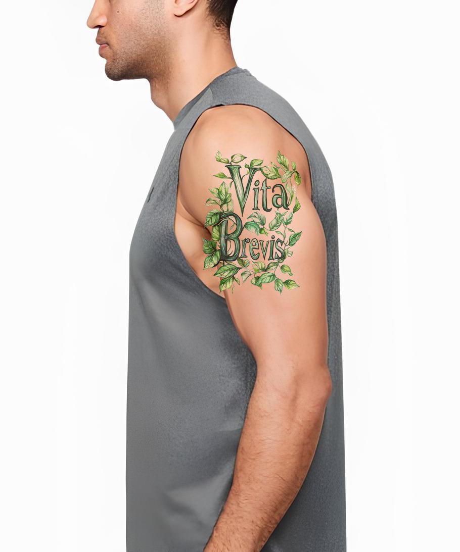 Botanical Latin typography entwines with lush ivy, the phrase Vita Brevis sculpted in deep green serif curves. Vining leaves symbolize endurance and renewal, holding the brevity of life with gentle strength. Wearing this feels rooted and awake, a living reminder to grow boldly and savor every fleeting breath.